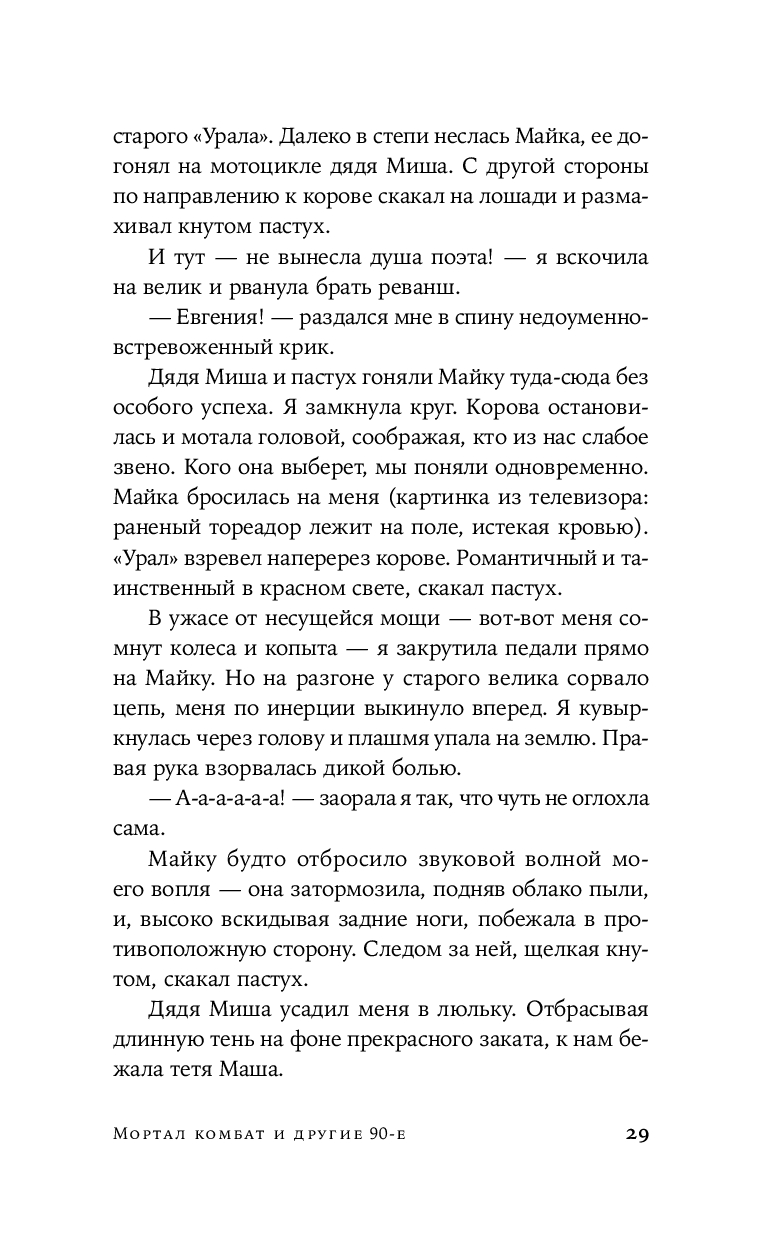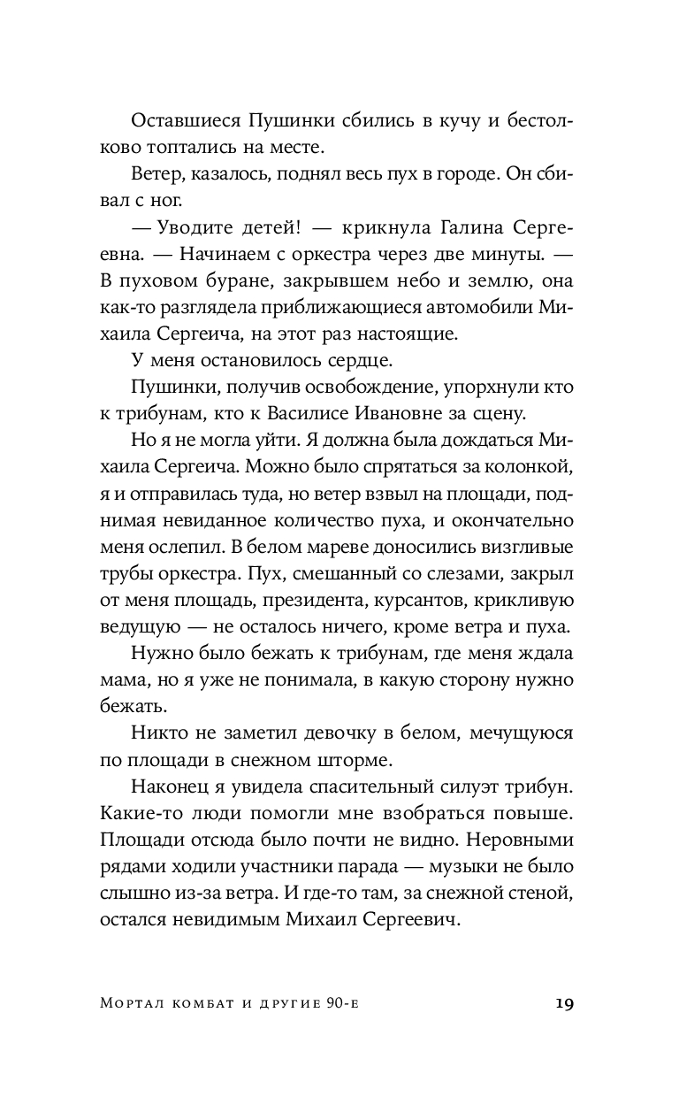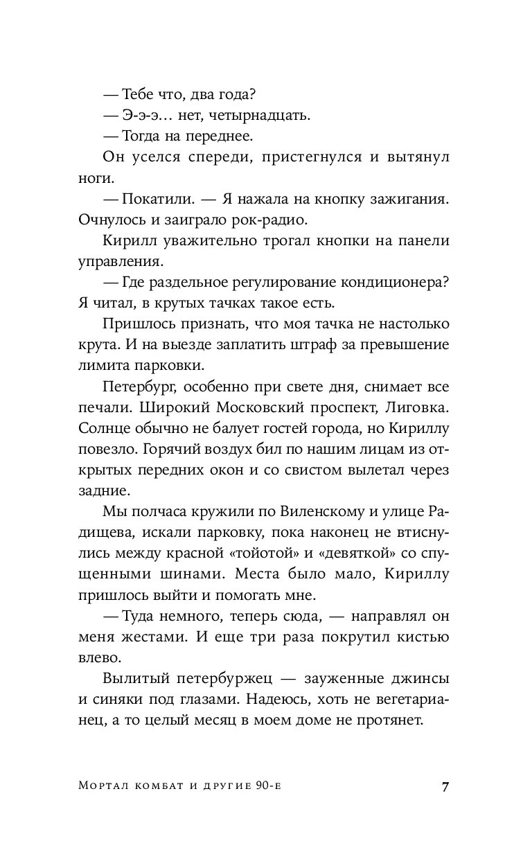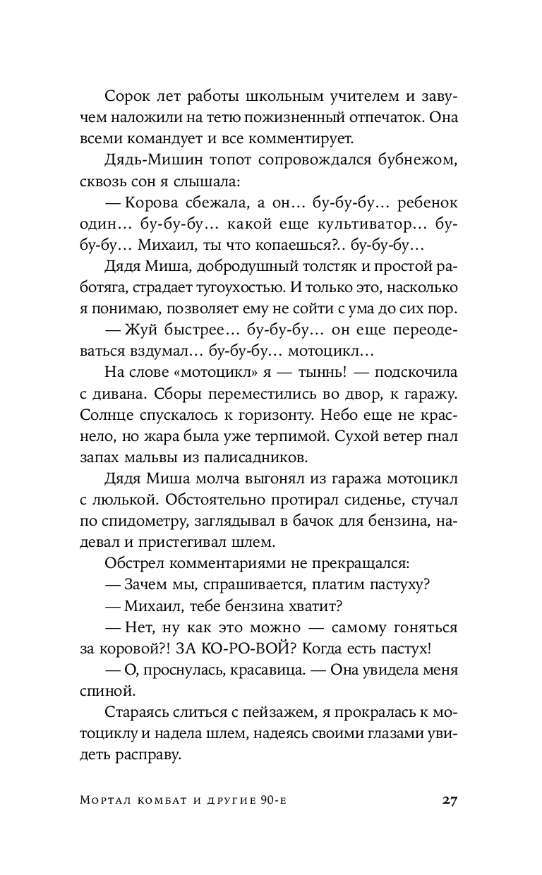 Сборник "Мортал комбат и другие 90-е" рассказывает о детстве в девяностые годы в Казахстане. Каждый сюжет – небольшая история взросления. Первые детские впечатления – погоня за коровой в деревне, ночное путешествие в плацкарте, страстное коллекционирование вкладышей – постепенно сменяются историями о подростковых переживаниях: влюбленностях, буллинге, дружбе, отношениях с родителями и с родным городом.