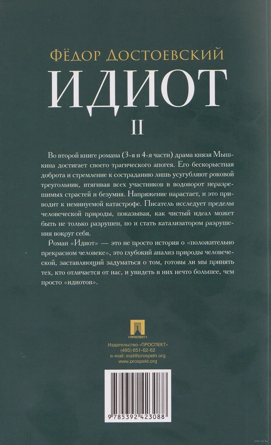 Во второй книге драма князя Мышкина достигает своего трагического апогея. Его бескорыстная доброта и стремление к состраданию лишь усугубляют роковой треугольник, втягивая всех участников в водоворот неразрешимых страстей и безумия. Напряжение нарастает, и это приводит к неминуемой катастрофе.