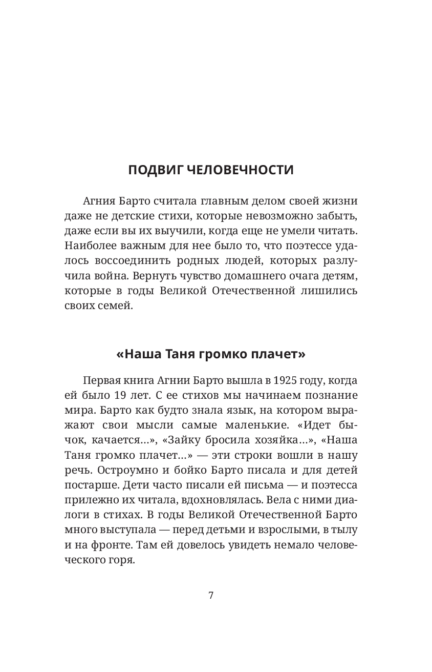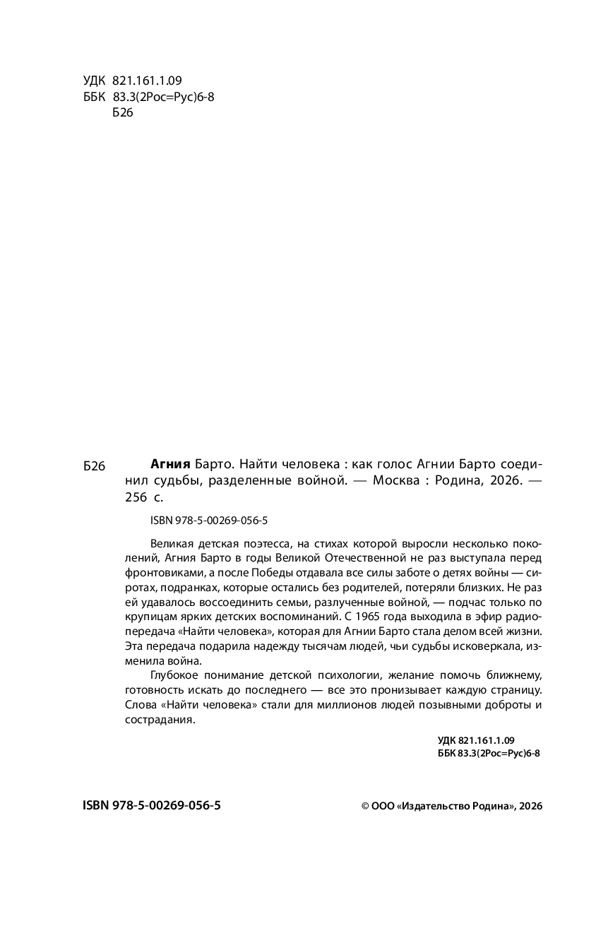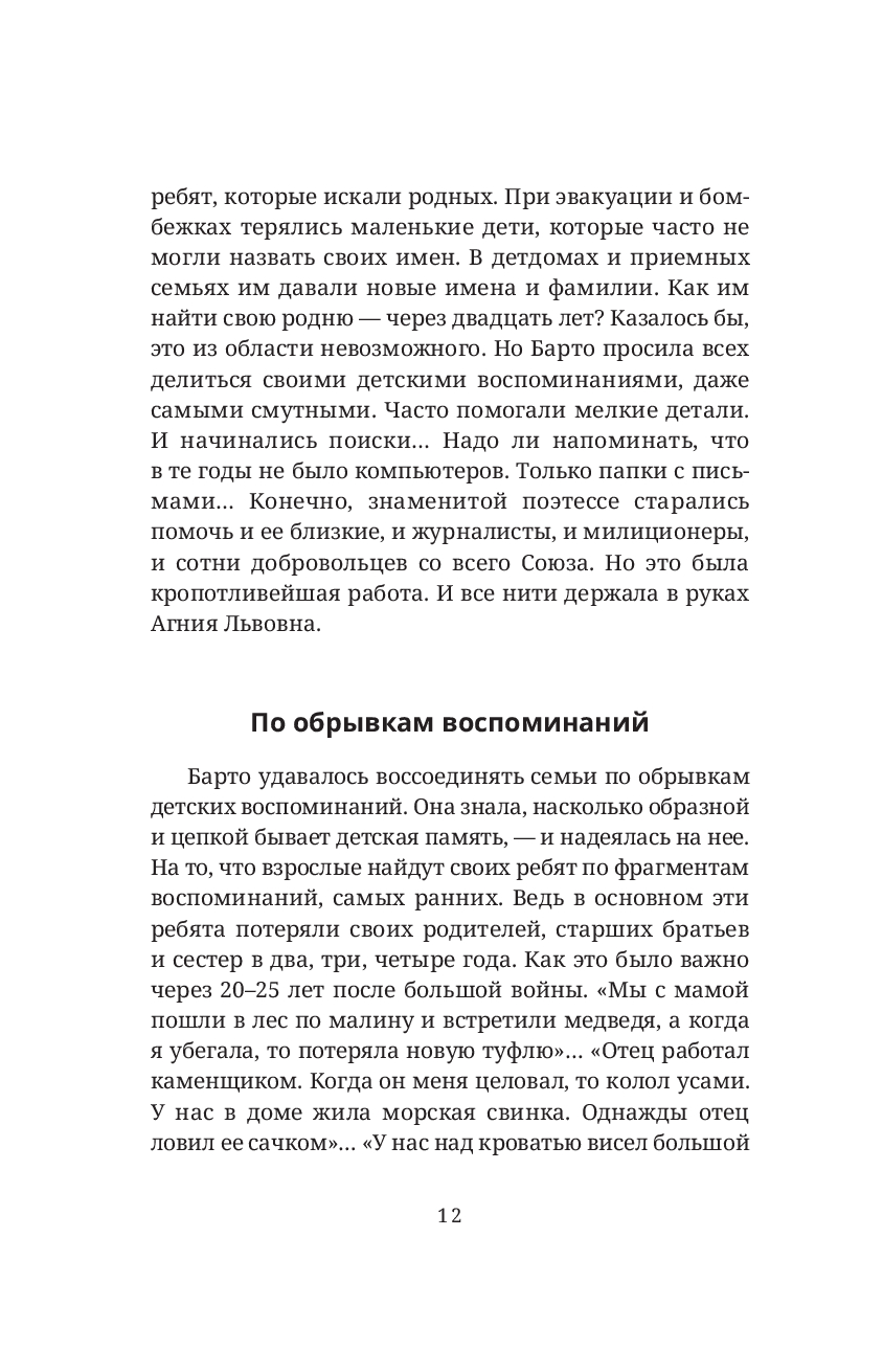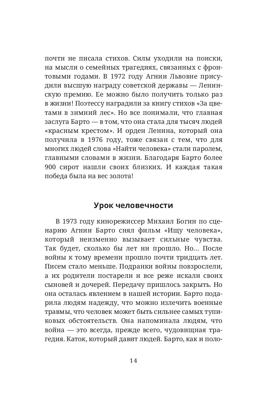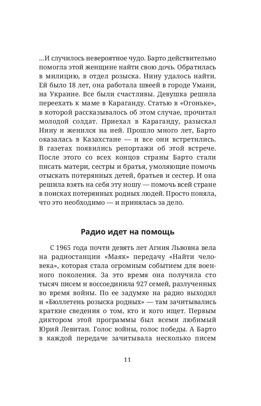 Великая детская поэтесса, на стихах которой выросли несколько поколений, Агния Барто в годы Великой Отечественной не раз выступала перед фронтовиками, а после Победы отдавала все силы заботе о детях войны – сиротах, подранках, которые остались без родителей, потеряли близких. Не раз ей удавалось воссоединить семьи, разлученные войной – подчас только по крупицам ярких детских воспоминаний. С 1965 года выходила в эфир радиопередача "Найти человека", которая для Агнии Барто стала делом всей жизни. Эта передача подарила надежду тысячам людей, чьи судьбы исковеркала, изменила война.