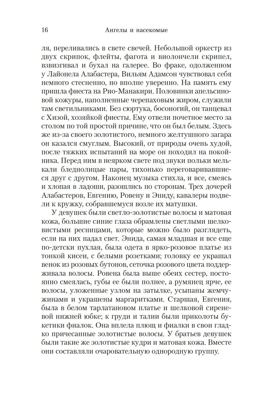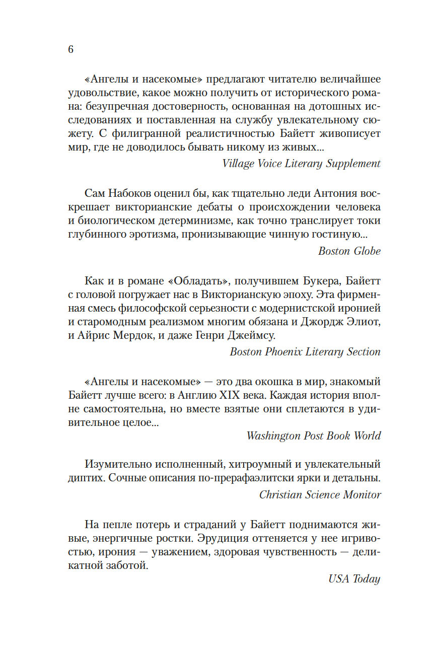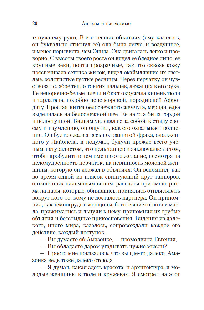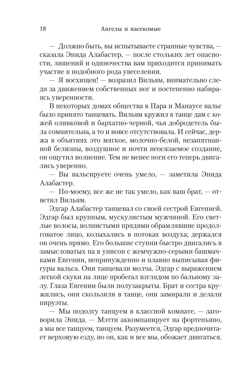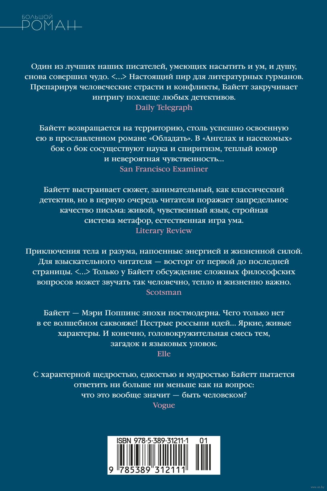От автора удостоенного Букеровской премии романа "Обладать", "Квартета Фредерики" и "Детской книги", от кавалерственной дамы ордена Британской империи – две взаимосвязанные повести о нравах викторианской знати, объединенные под общим названием "Ангелы и насекомые". Это – "возможно, лучшая книга Байетт после "Обладать"" (Times Literary Supplement). Искренность чувств сочетается здесь с интеллектуальной игрой, историческая достоверность – с вымыслом. Здесь потерпевший кораблекрушение натуралист пытается найти счастье в семье, где тайные страсти так же непостижимы, как и поведение насекомых, а увлекающиеся спиритизмом последователи шведского мистика Сведенборга и вправду оказываются во власти призрака…