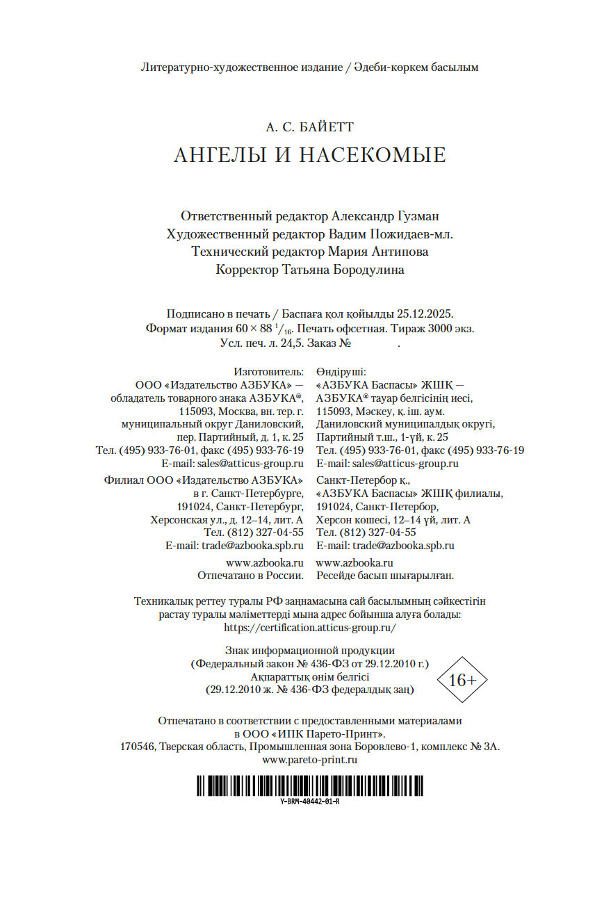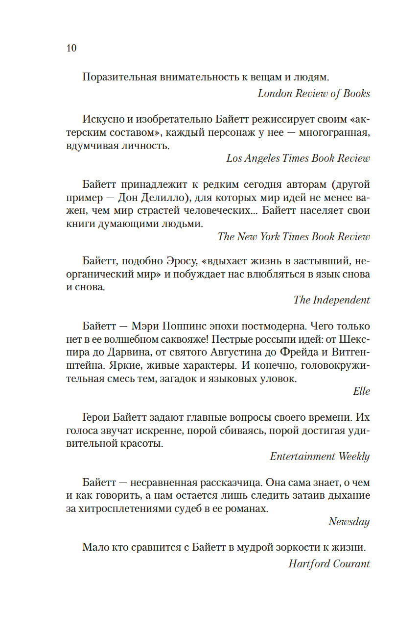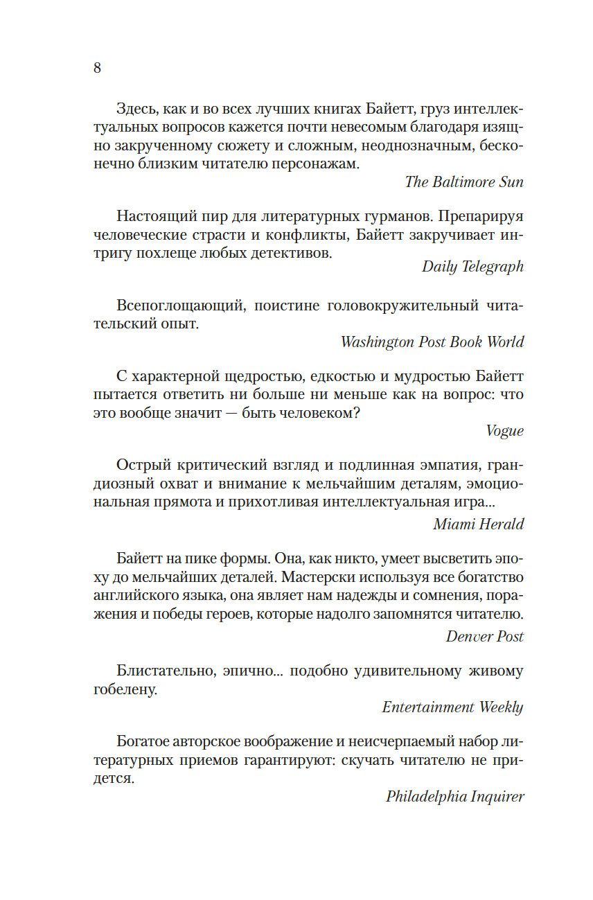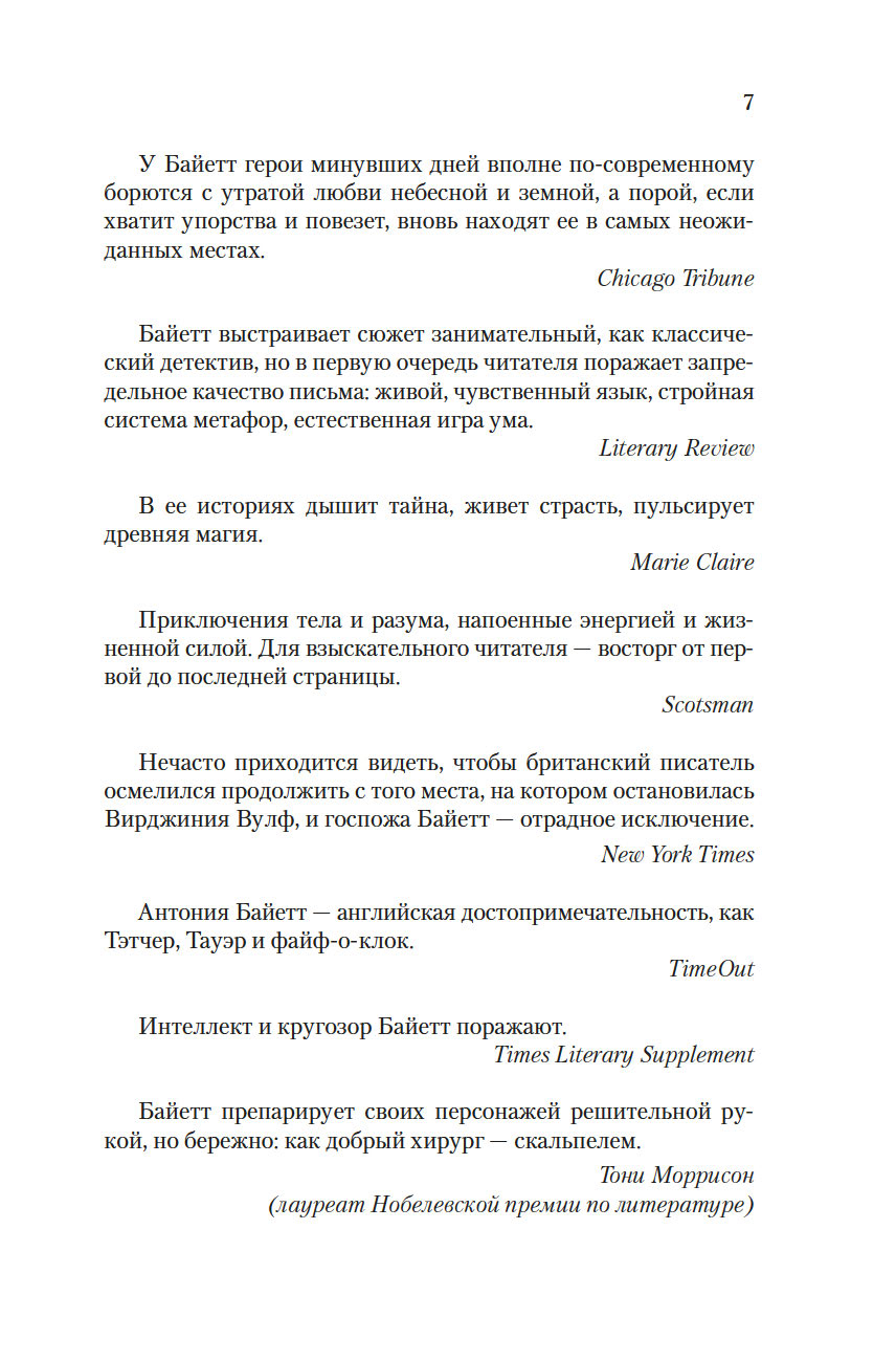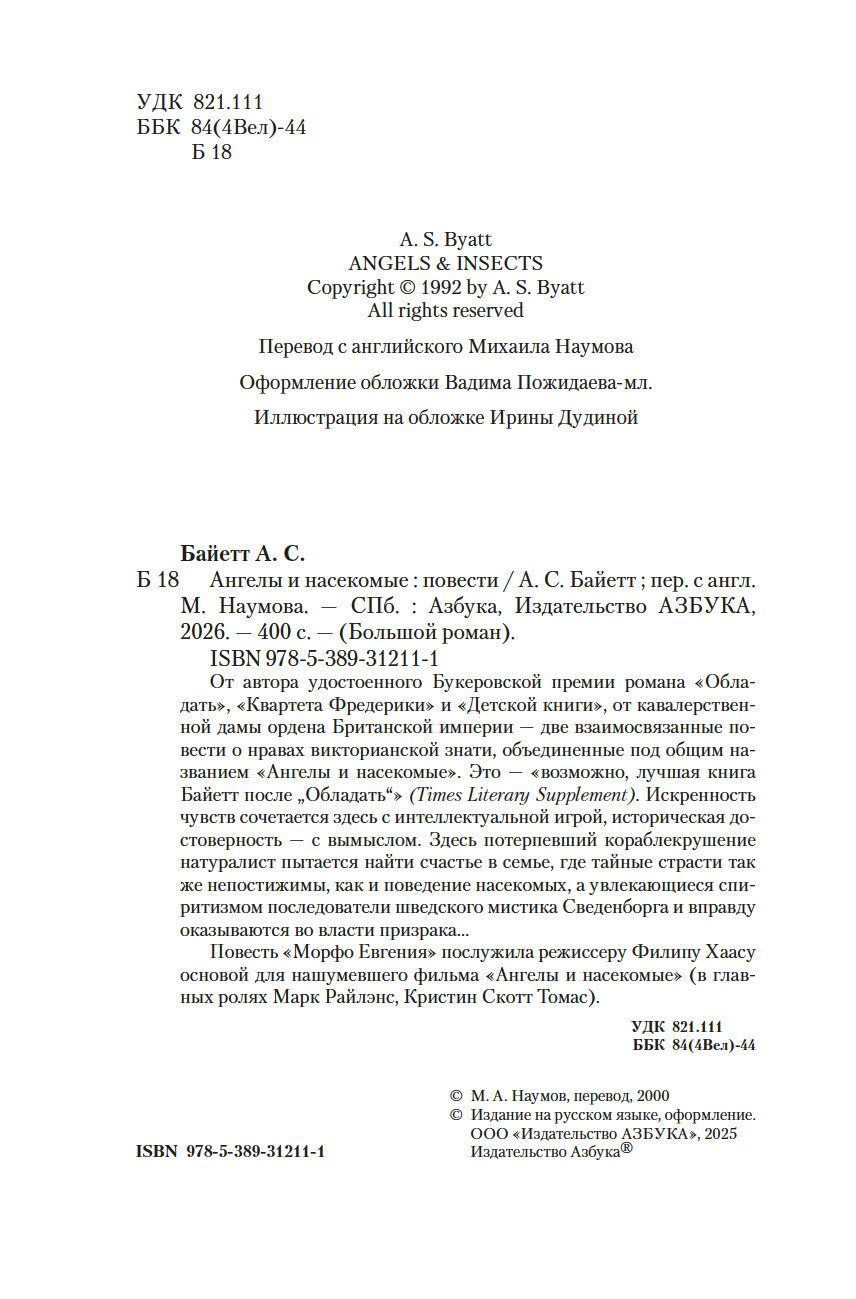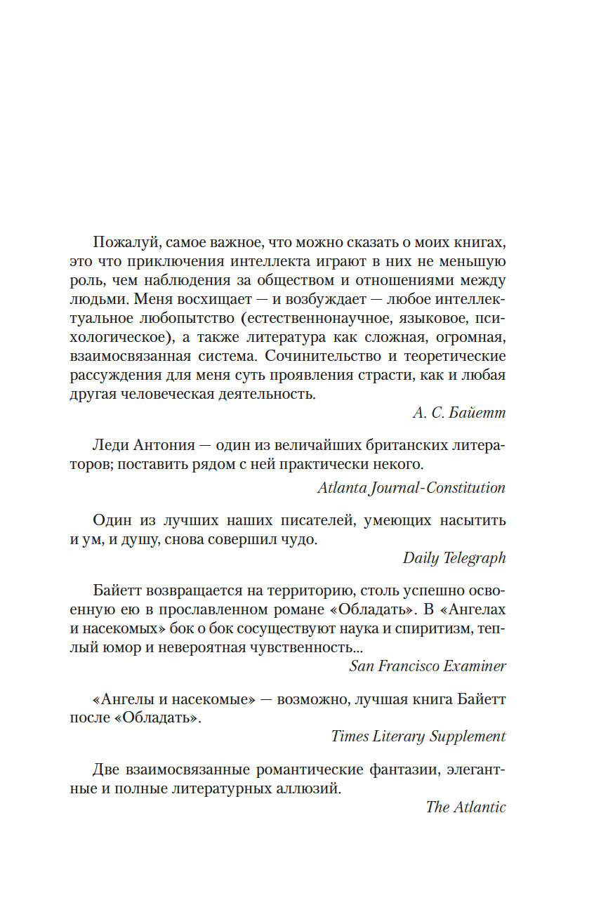 От автора удостоенного Букеровской премии романа "Обладать", "Квартета Фредерики" и "Детской книги", от кавалерственной дамы ордена Британской империи – две взаимосвязанные повести о нравах викторианской знати, объединенные под общим названием "Ангелы и насекомые". Это – "возможно, лучшая книга Байетт после "Обладать"" (Times Literary Supplement). Искренность чувств сочетается здесь с интеллектуальной игрой, историческая достоверность – с вымыслом. Здесь потерпевший кораблекрушение натуралист пытается найти счастье в семье, где тайные страсти так же непостижимы, как и поведение насекомых, а увлекающиеся спиритизмом последователи шведского мистика Сведенборга и вправду оказываются во власти призрака…
