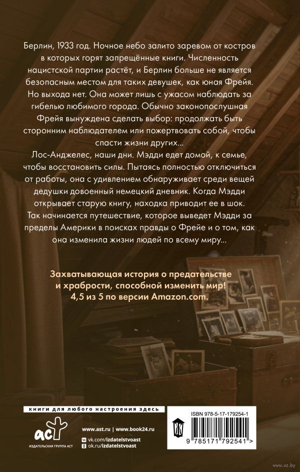 Берлин, 1933 год. Ночное небо залито заревом от костров, в которых горят запрещённые книги. Численность нацистской партии растёт, и Берлин больше не является безопасным местом для таких девушек, как юня Фрейя. Но выхода нет. Она может лишь с ужасом наблюдать за гибелью любимого города. Обычно законопослушная Фрейя вынуждена сделать выбор: продолжать быть сторонним наблюдателем или пожертвовать собой, чтобы спасти жизни других...