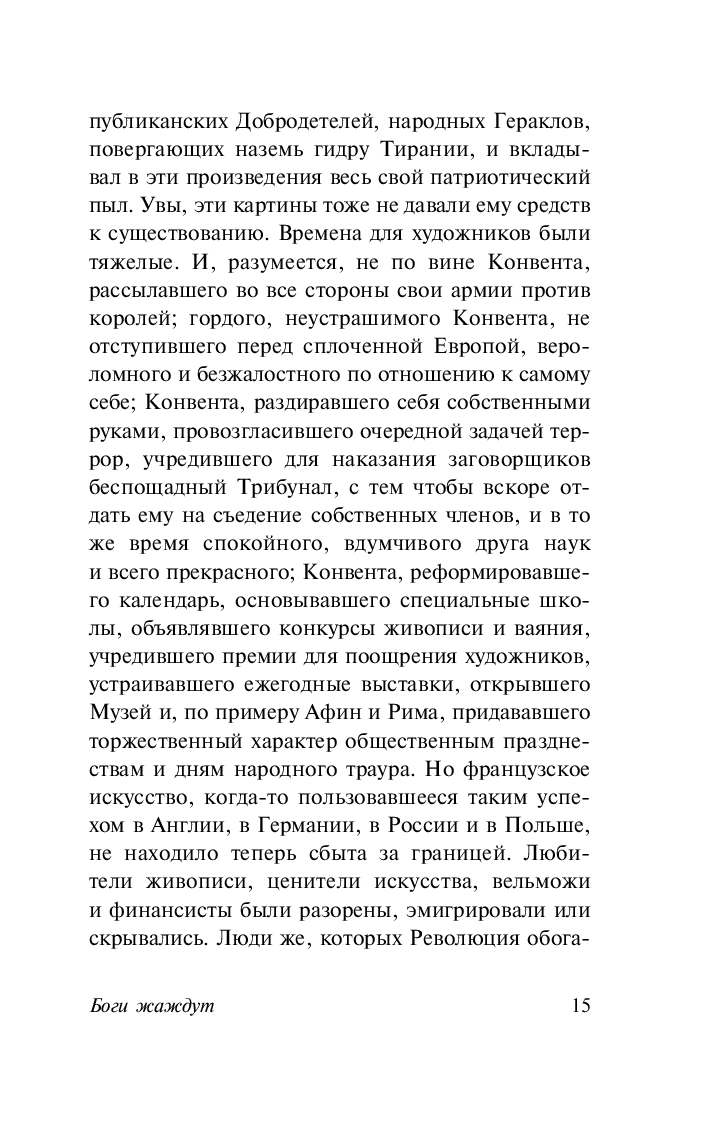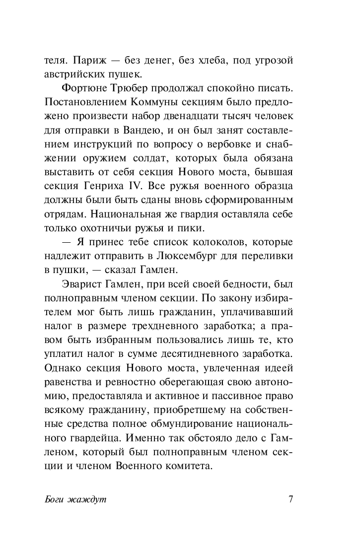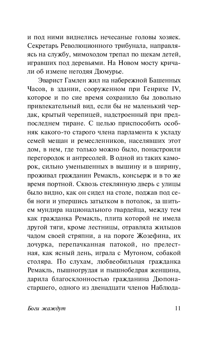 Действие романа "Боги жаждут" разворачивается в разгар Великой французской революции. Молодой идеалист Эварист Гамлен с пылом поддерживает идеалы Дантона, Робеспьера и Марата. Когда ему предлагают место присяжного революционного трибунала, Эварист усердно берется за борьбу с врагами республики, с одинаковой безжалостностью отправляя на эшафот как аристократов и финансистов, так и грузчиков и служанок. Ведь когда маховик террора запущен, боги вечно жаждут новой крови, и гильотина не может простаивать ни дня.
