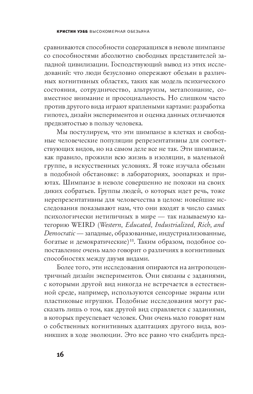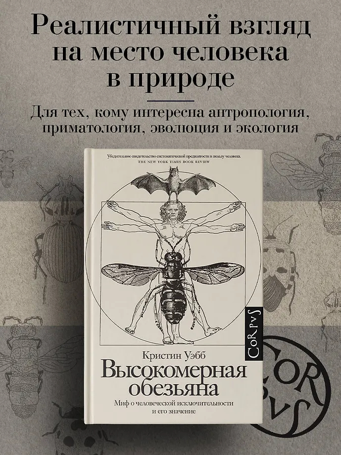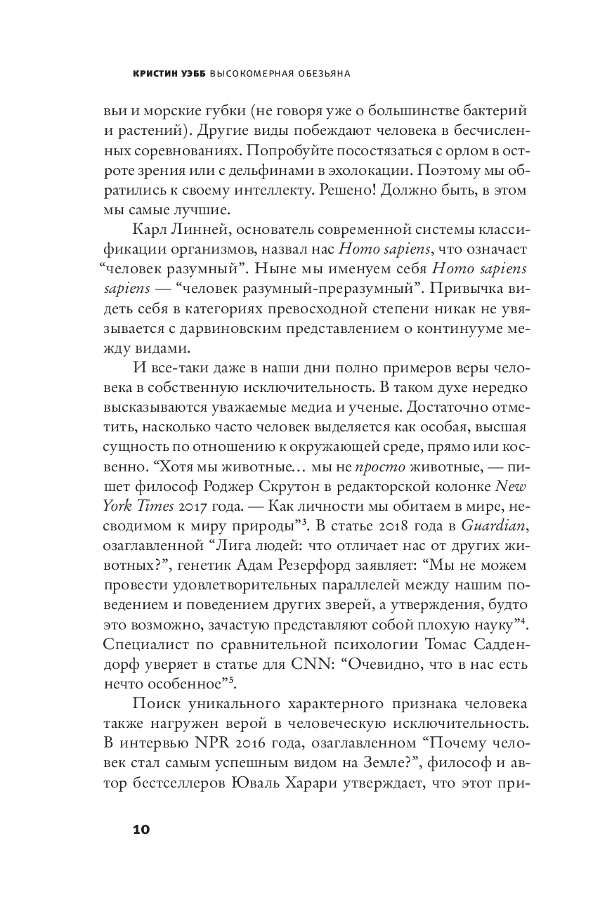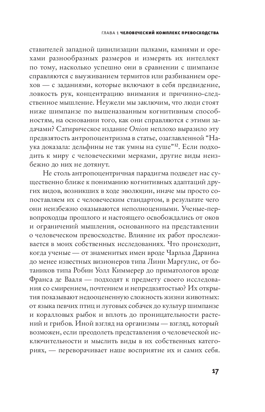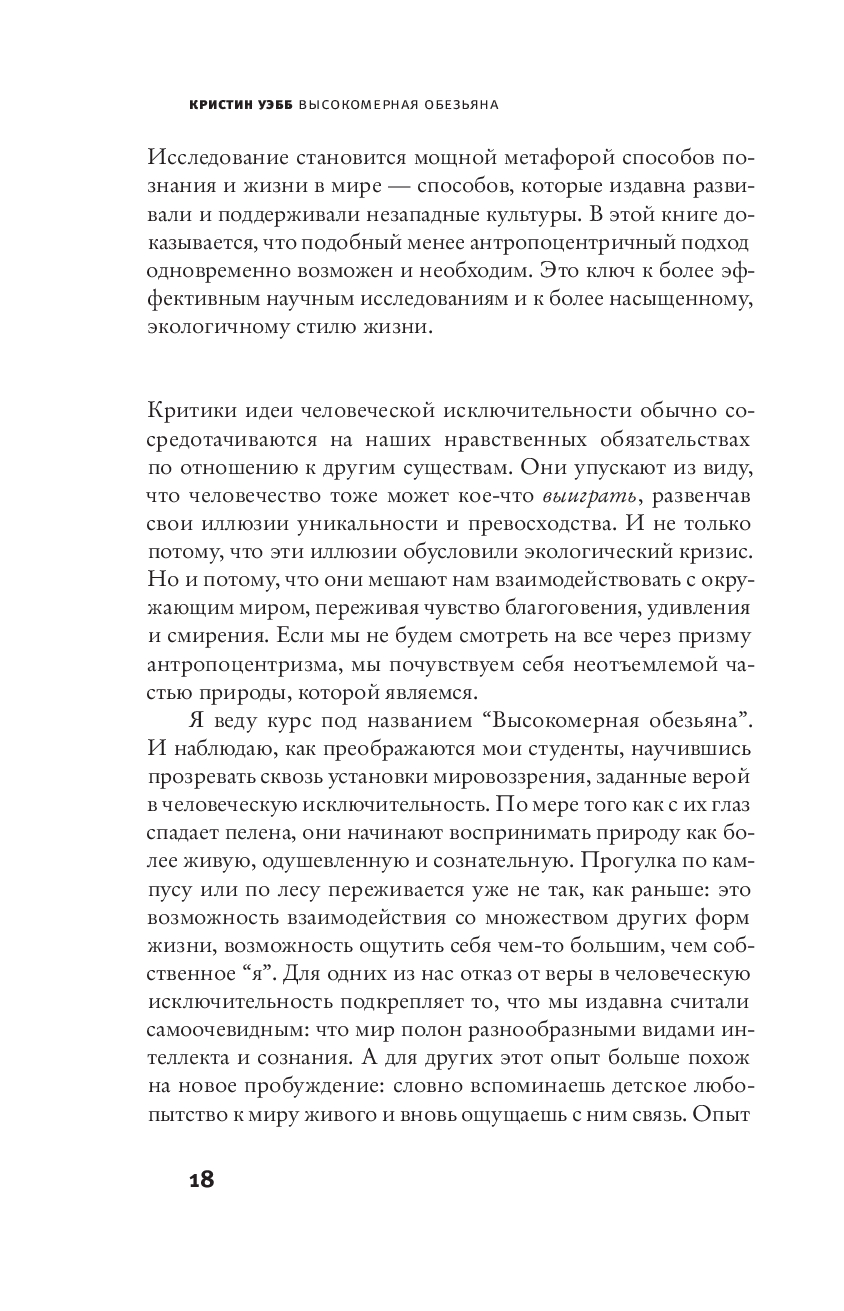 Человек издавна назначил себя “мерой всех вещей” и провозгласил, что он наиболее умный, нравственный и способный вид на Земле. И как следствие – обратил природу в товар, простой ресурс. Именно вера в человеческое превосходство лежит в основе нынешнего экологического кризиса. Приматолог Кристин Уэбб, посвятившая годы изучению богатой социальной, эмоциональной и когнитивной жизни наших ближайших из ныне живущих родственников, всесторонне исследует явление антропоцентризма. Она показывает, что человеческая исключительность – это миф, который опирается больше на человеческую культуру, чем на нашу биологию, больше на заблуждения, чем на научные доказательства, и намечает для нас более здравый подход к природе и самим себе.