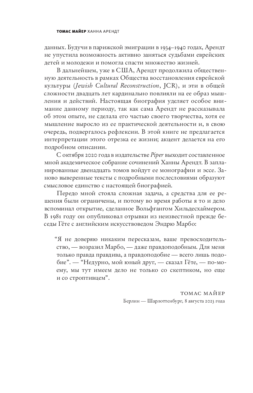 Ханна Арендт – всемирно известный философ и политический теоретик, чье имя в массовом сознании неразрывно связано с тезисом о “банальности зла” и понятием “тоталитаризм”. Ее работы считаются классикой политической мысли ХХ века и неизменно пользуются вниманием читателей, однако о ее жизни написано не так много. В этой долгожданной биографии Томас Майер показывает, как личный опыт Арендт – учеба у лучших философов своего времени, бегство из нацистской Германии, практическая деятельность по спасению еврейской молодежи и культурных ценностей, о которой ранее почти ничего не было известно, – сформировал ее взгляды и идеи, не утратившие своей актуальности и по сей день. Сколь бы разных вопросов они ни касались, их объединяет одно: потребность осмыслить человеческое существование. За ними стоит фигура, чей девиз гласил: “Я должна понять”.