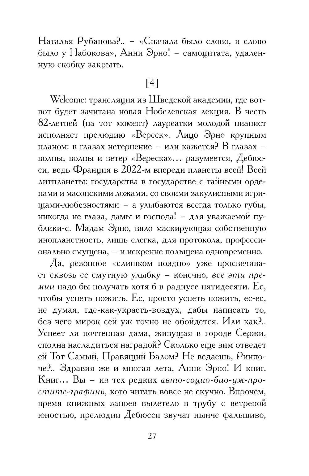 Новая книга Натальи Рубановой приглашает читателя-зрителя в литературный синематограф. Ироничная критика и эссеистика лауреата Премии "Нонконформизм"2 парадоксально киногеничны: начинается артхаусная книголента с досье на французскую нобелиатку Анни Эрно, а завершается фееричной беседой со шведской сказочницей Астрид Линдгрен.