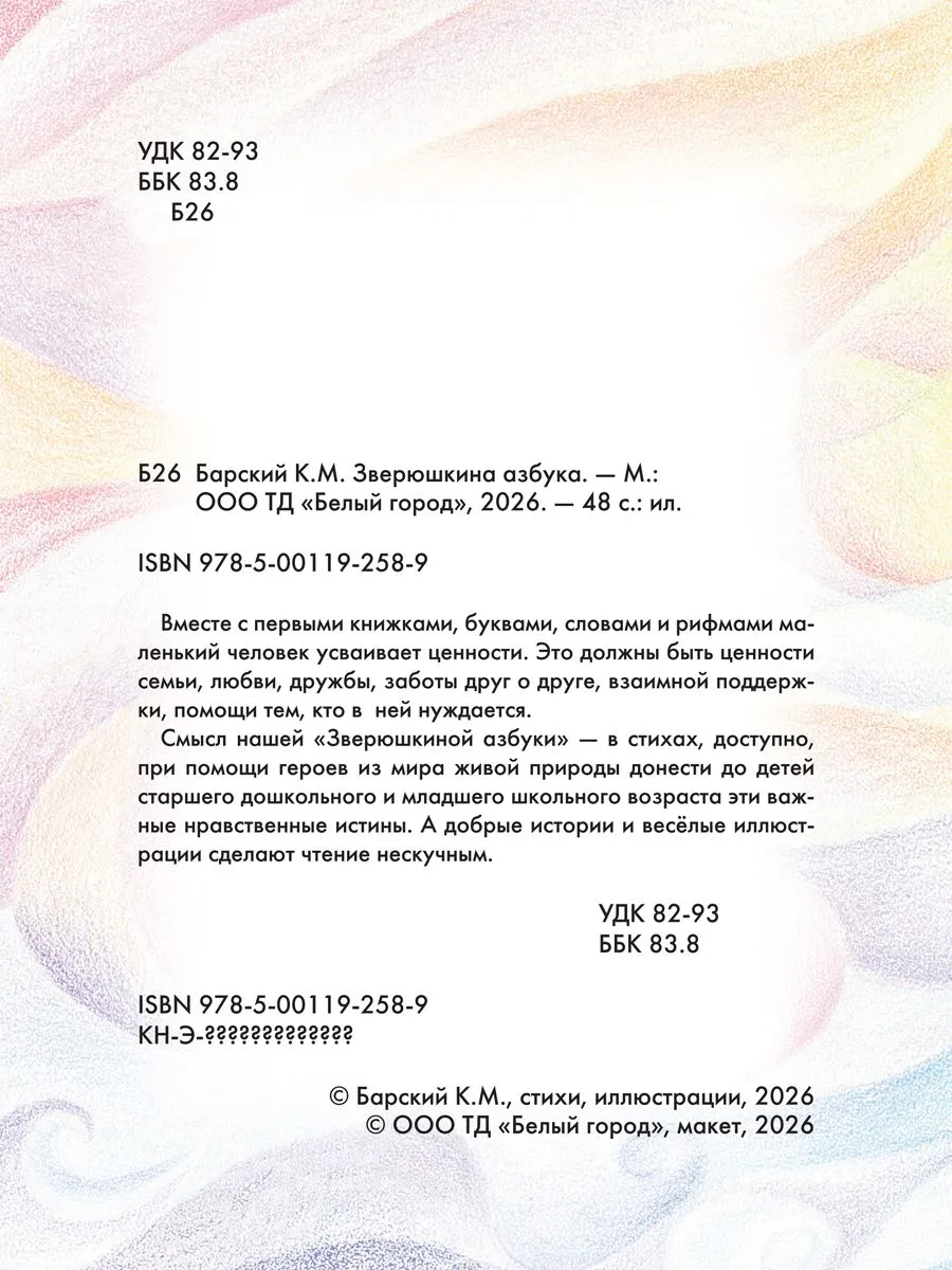 Смысл нашей "Зверюшкиной азбуки" – в стихах, доступно, при помощи героев из мира живой природы донести до детей старшего дошкольного и младшего школьного возраста эти важные нравственные истины. А добрые истории и весёлые иллюстрации сделают чтение нескучным.