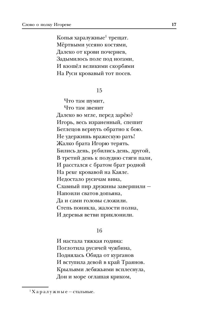 Поэтическая повесть о подвиге князя Игоря и его дружины "Слово о полку Игореве" в переводе Н. А. Заболоцкого воспевает ратное мужество князей. В первой русской летописи "Повесть временных лет", данной в переводе Д. С. Лихачёва, рассказывается о происхождении Руси и ключевых событиях ее ранней истории, а жития святых, формировавших нравственные ориентиры многих поколений, раскрывают примеры стойкости и духовного подвига.