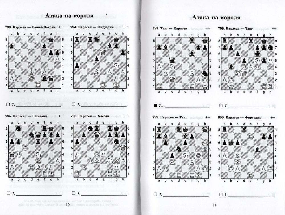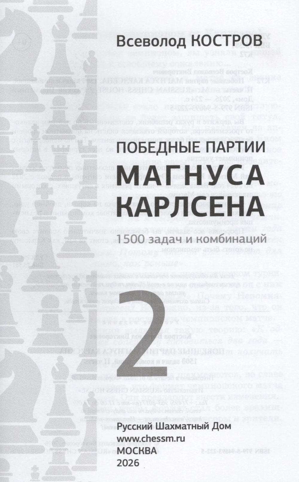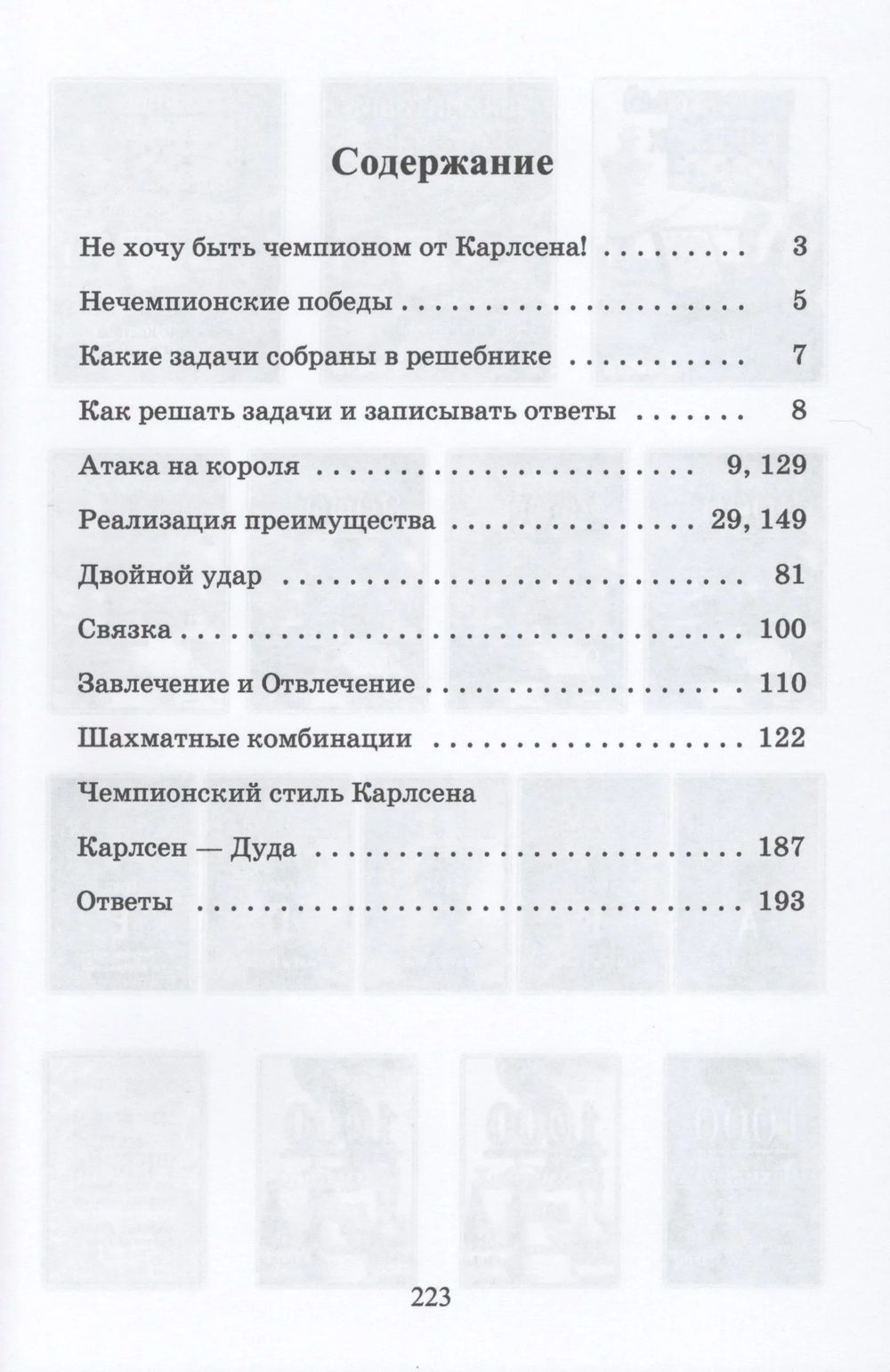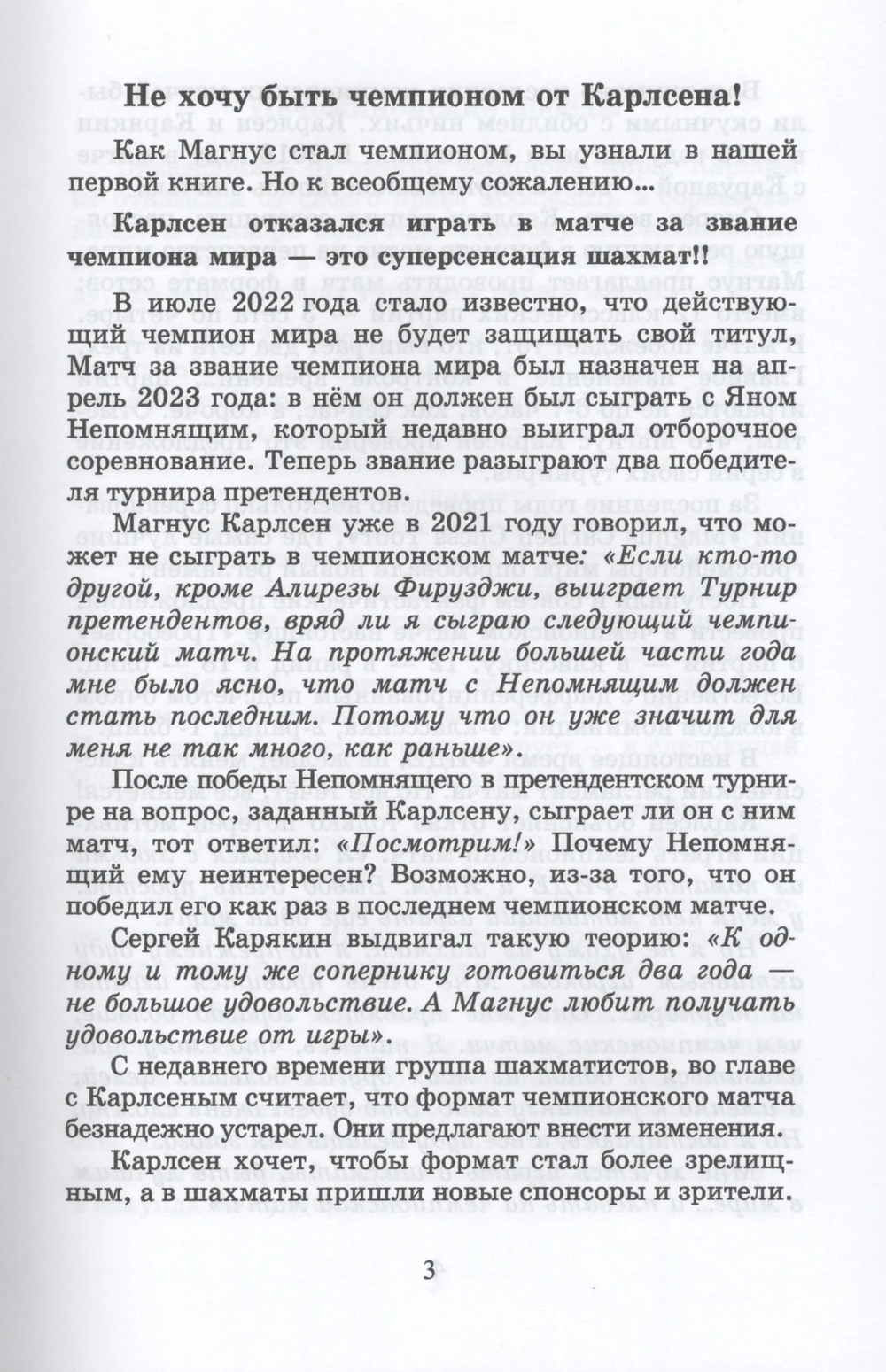 Ваша задача – найти решения в ситуациях, с которыми сталкивался сам Магнус. Позиции распределены по темам: атака на короля, двойной удар, связка, завлечение и отвлечение, шахматные комбинации и реализация преимущества. Прорешав все задачи, вы безусловно значительно усилите свою игру. А дальше сможете решить для себя, стоит ли вам, как Карлсену, не хотеть быть чемпионом…