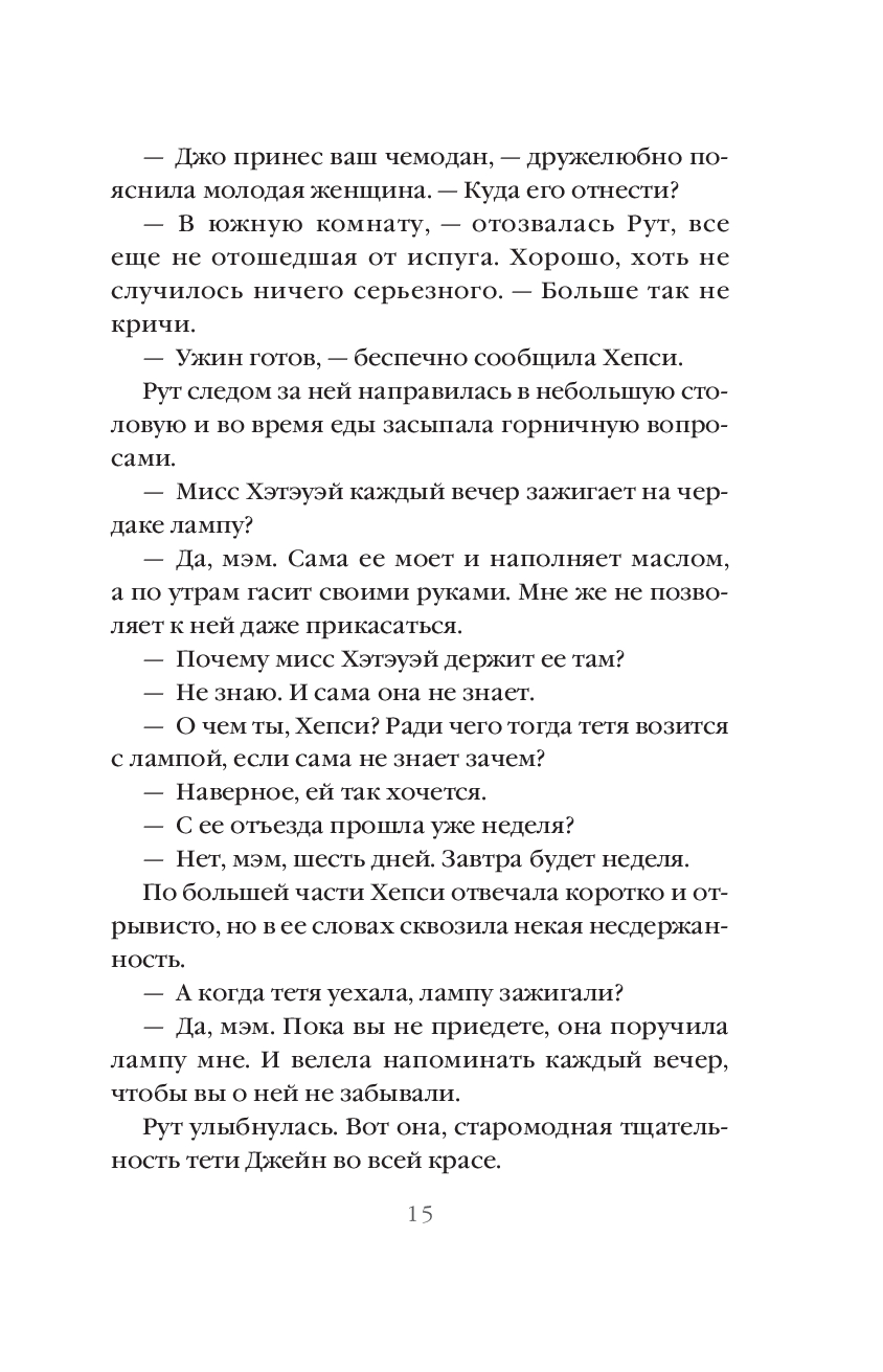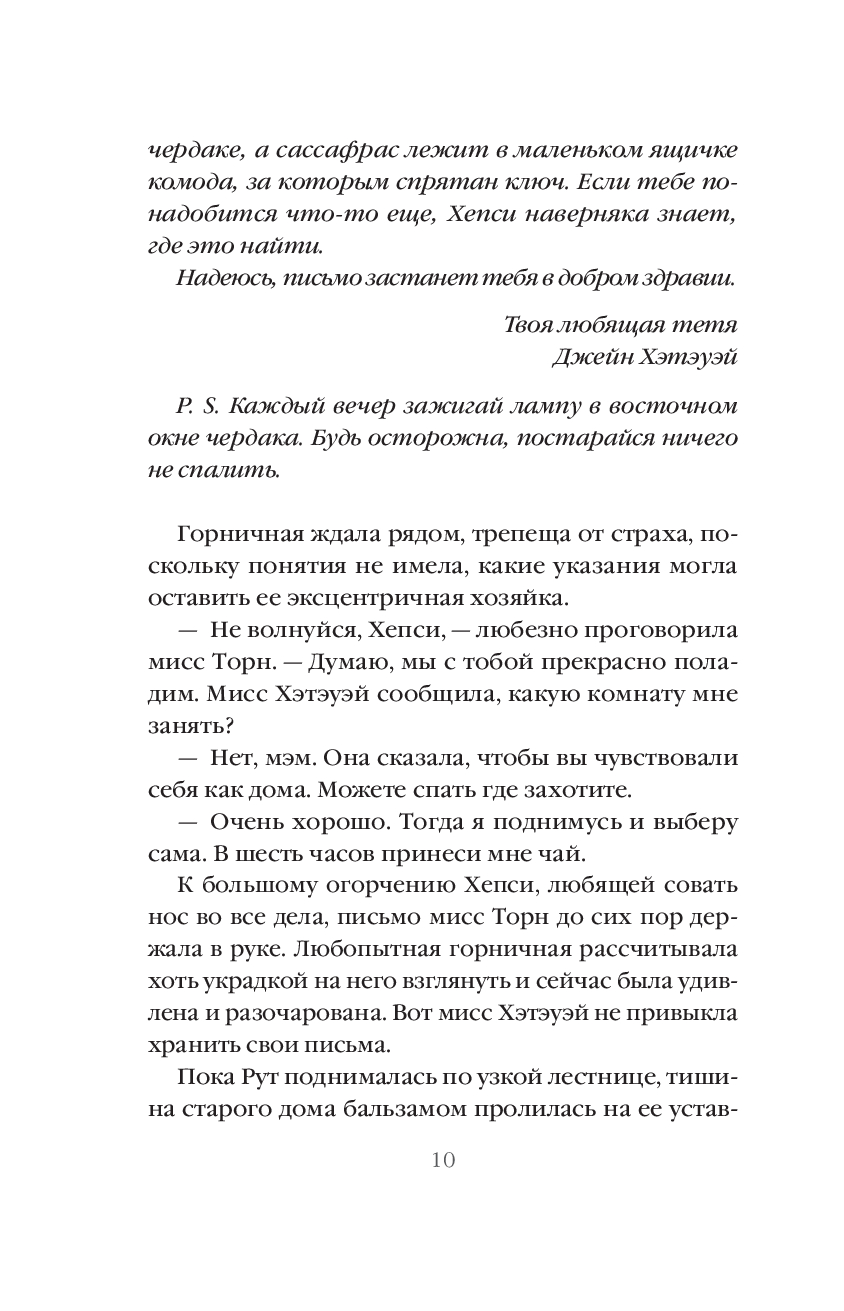 Между Рут и Карлом постепенно зарождаются чувства, и вскоре они планируют совместное будущее. Однако возвращение тети с новым мужем меняет привычный ход событий, и Рут на время переезжает к мисс Эйнсли. Так проходит еще пара месяцев безмятежной жизни. Карл и Рут планируют скорую свадьбу. Но однажды мисс Эйнсли встает с постели совсем в другом настроении, чем обычно, и рассказывает Рут свою тайну, и зачем была нужна лампа в доме тёти Джейн.