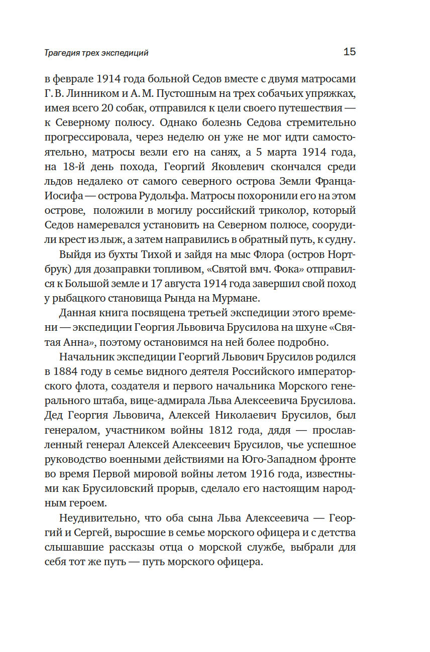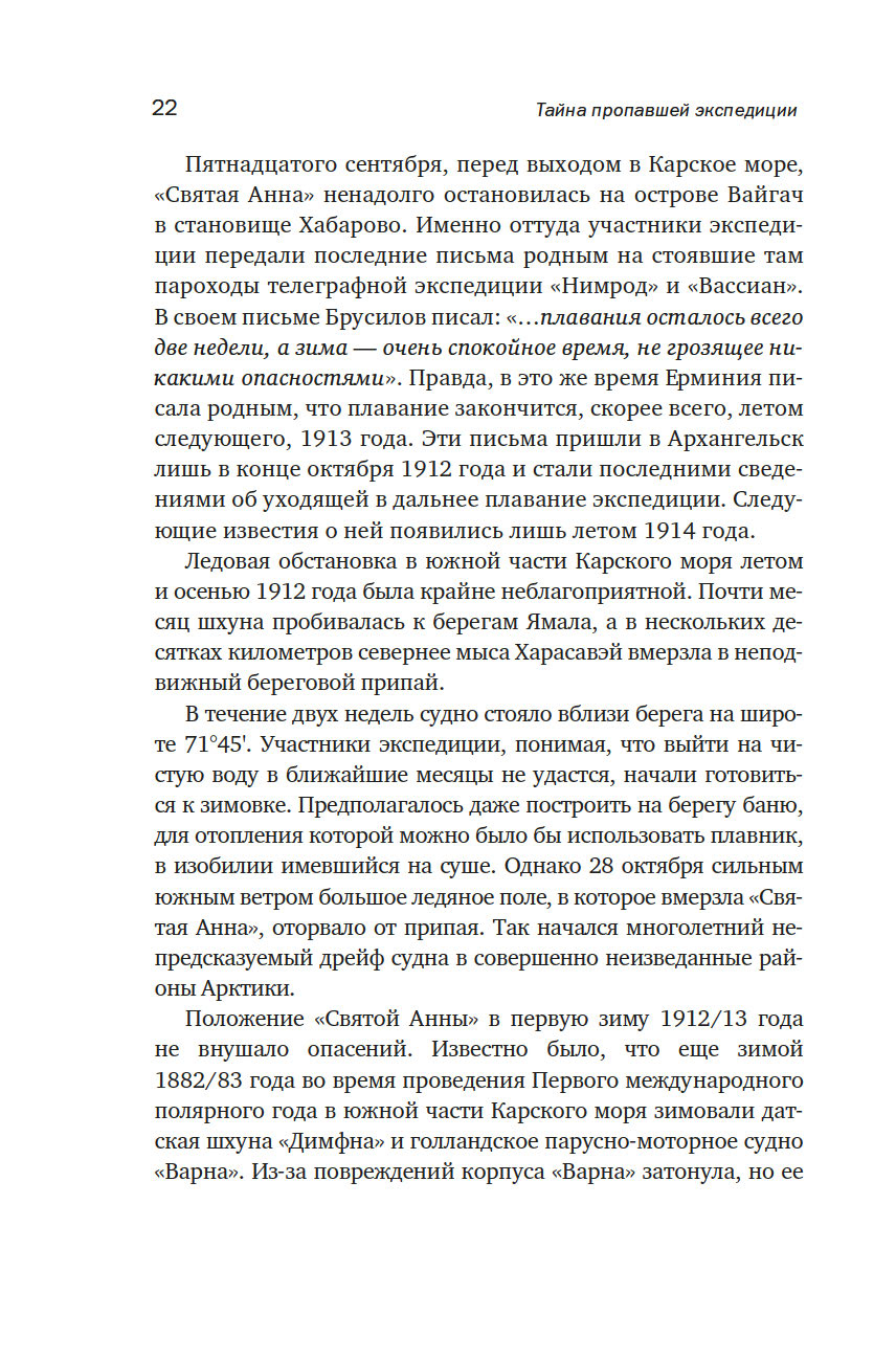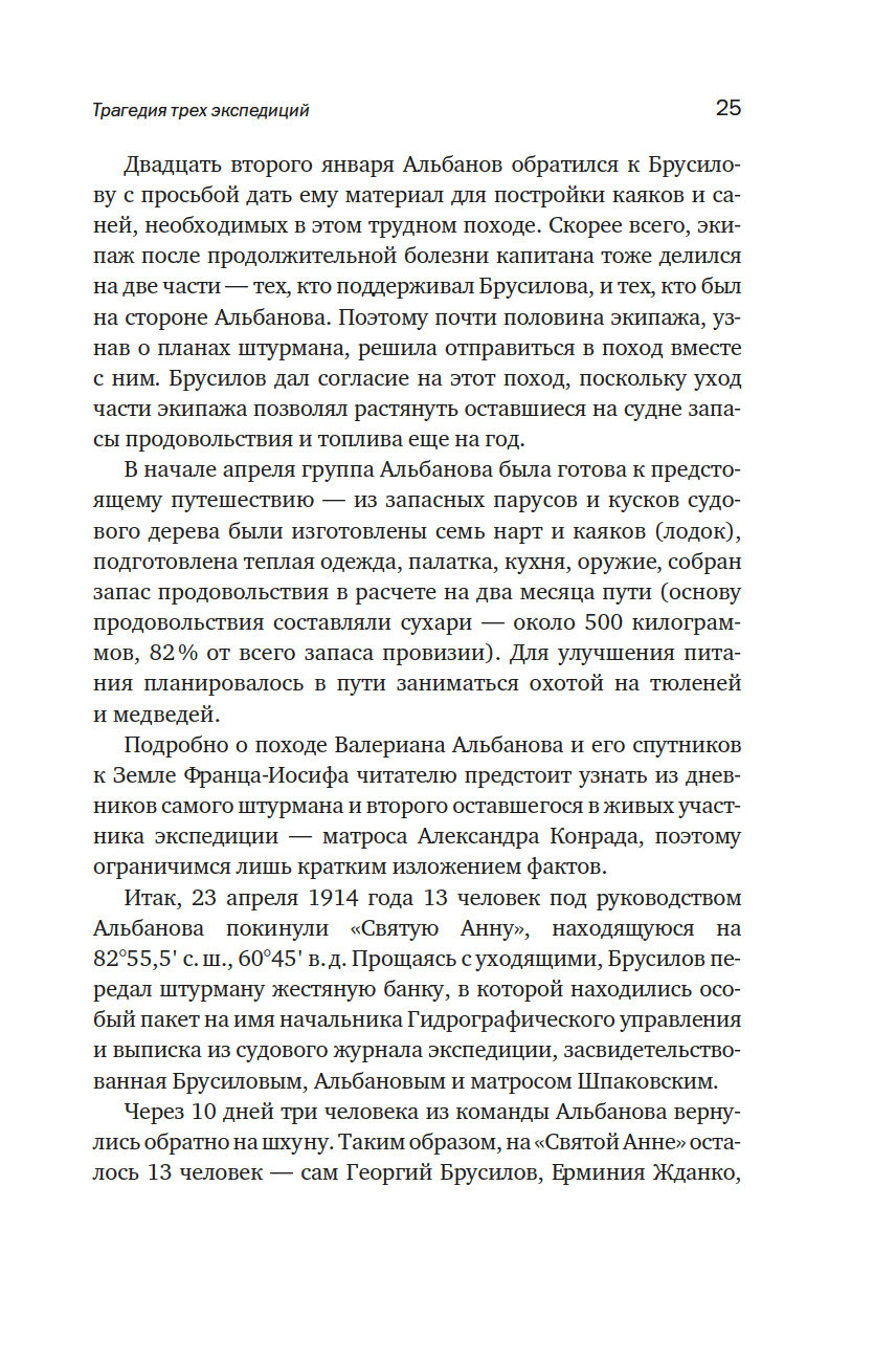 История одной из первых экспедиций, участвовавших в освоении русской Арктики полна ярких и драматических страниц. Вышедшая из Санкт-Петербурга в июле 1912 года шхуна "Святая Анна" уже в октябре оказалась зажатой во льдах Карского моря, стремительно относимых течением на север, к Новой Земле. Не сумев вырваться из ледяной ловушки, часть экипажа решила вернуться на материк. Путь занял четыре месяца вместо предполагаемого одного. Из одиннадцати человек, покинувших судно в апреле 1914 года, до Земли Франца-Иосифадошли только двое, штурман Валериан Альбанов и матрос Александр Конрад.