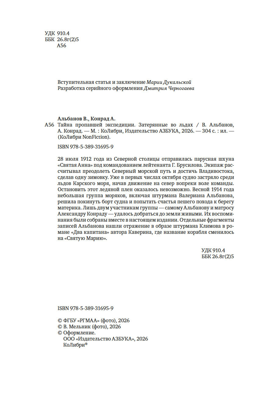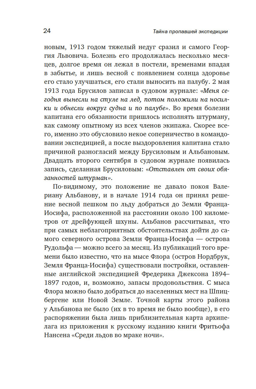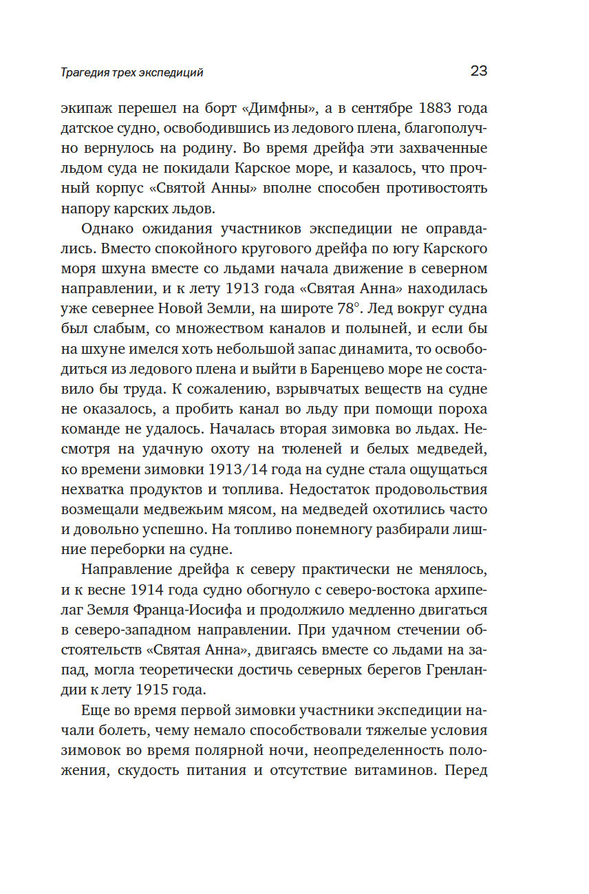 История одной из первых экспедиций, участвовавших в освоении русской Арктики полна ярких и драматических страниц. Вышедшая из Санкт-Петербурга в июле 1912 года шхуна "Святая Анна" уже в октябре оказалась зажатой во льдах Карского моря, стремительно относимых течением на север, к Новой Земле. Не сумев вырваться из ледяной ловушки, часть экипажа решила вернуться на материк. Путь занял четыре месяца вместо предполагаемого одного. Из одиннадцати человек, покинувших судно в апреле 1914 года, до Земли Франца-Иосифадошли только двое, штурман Валериан Альбанов и матрос Александр Конрад.