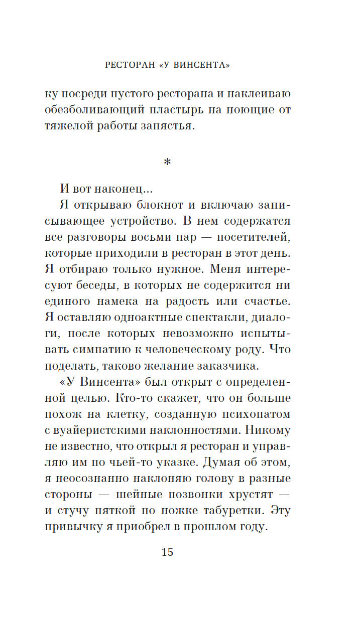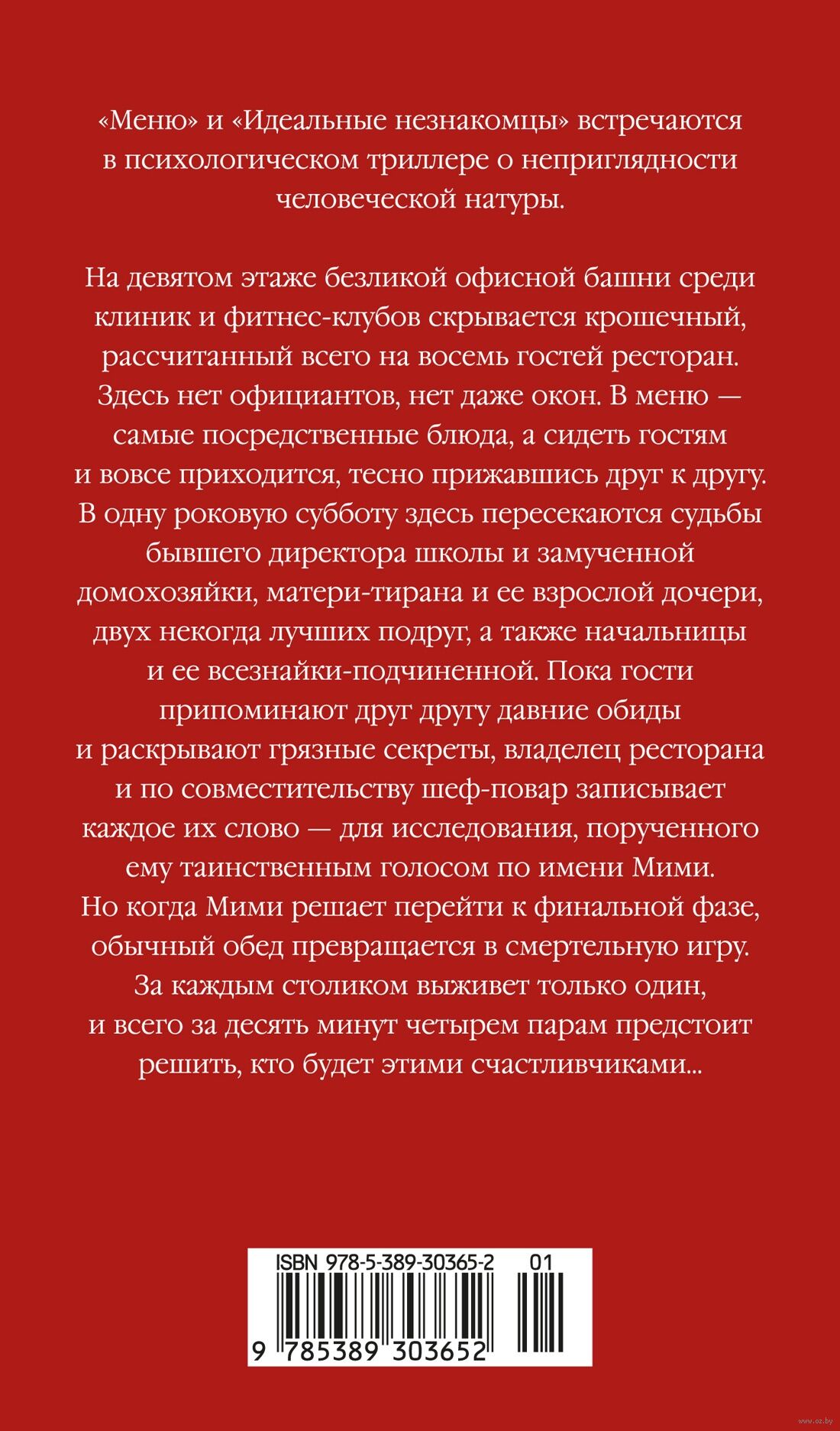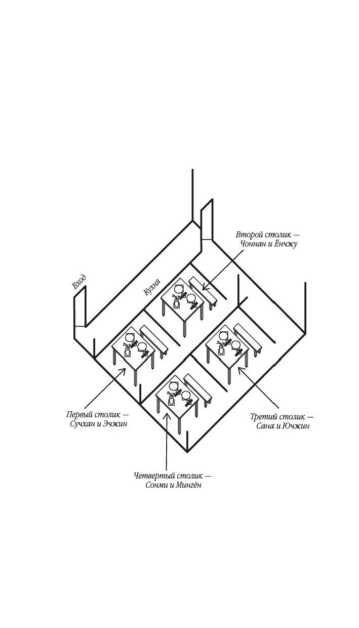 На девятом этаже безликой офисной башни среди клиник и фитнес-клубов скрывается крошечный, рассчитанный всего на восемь гостей ресторан. Здесь нет официантов, нет даже окон. В меню – самые посредственные блюда, а сидеть гостям и вовсе приходится, тесно прижавшись друг к другу. В одну роковую субботу здесь пересекаются судьбы бывшего директора школы и замученной домохозяйки, матери-тирана и ее взрослой дочери, двух некогда лучших подруг, а также начальницы и ее всезнайки-подчиненной. Пока гости припоминают друг другу давние обиды и раскрывают грязные секреты, владелец ресторана и по совместительству шеф-повар записывает каждое их слово – для исследования, порученного ему таинственным голосом по имени Мими. Но когда Мими решает перейти к финальной фазе, обычный обед превращается в смертельную игру. За каждым столиком выживет только один, и всего за десять минут четырем парам предстоит решить, кто будет этими счастливчиками…
