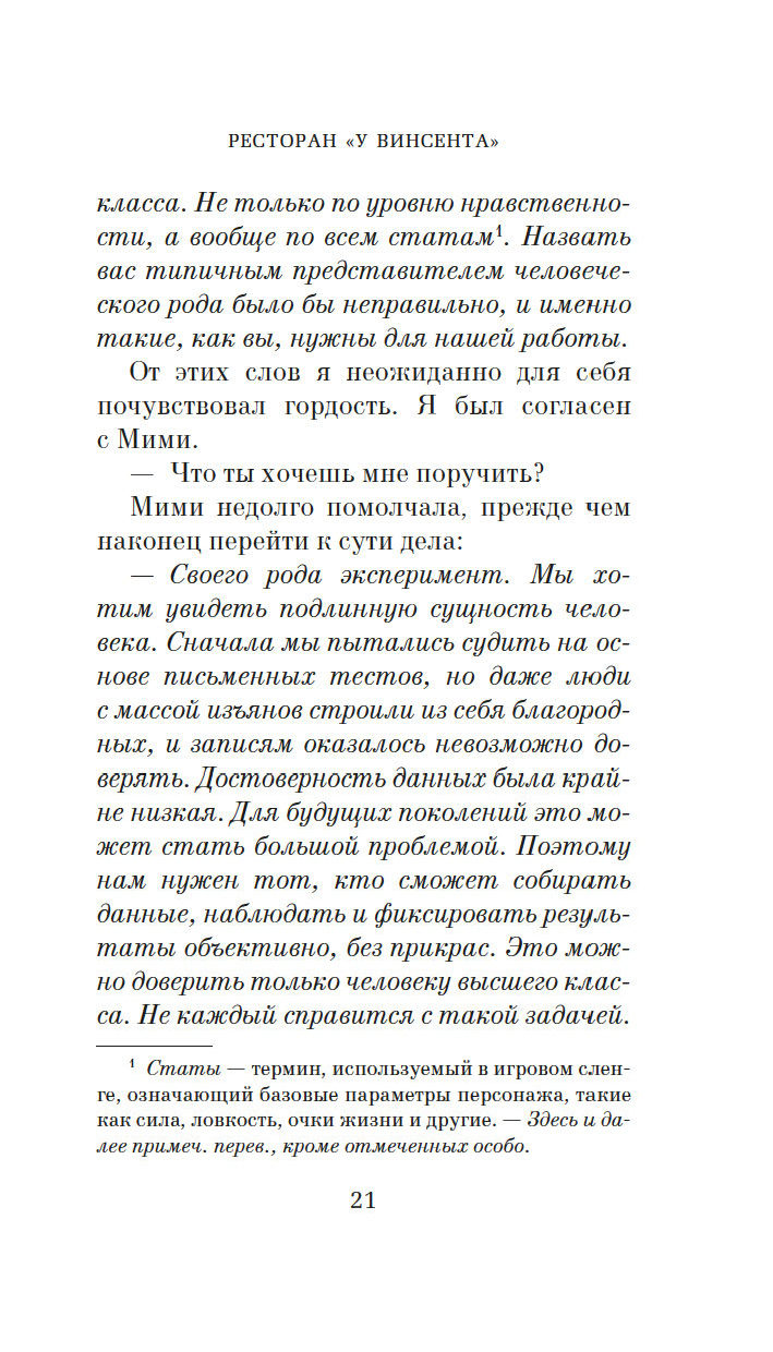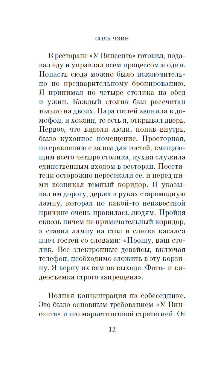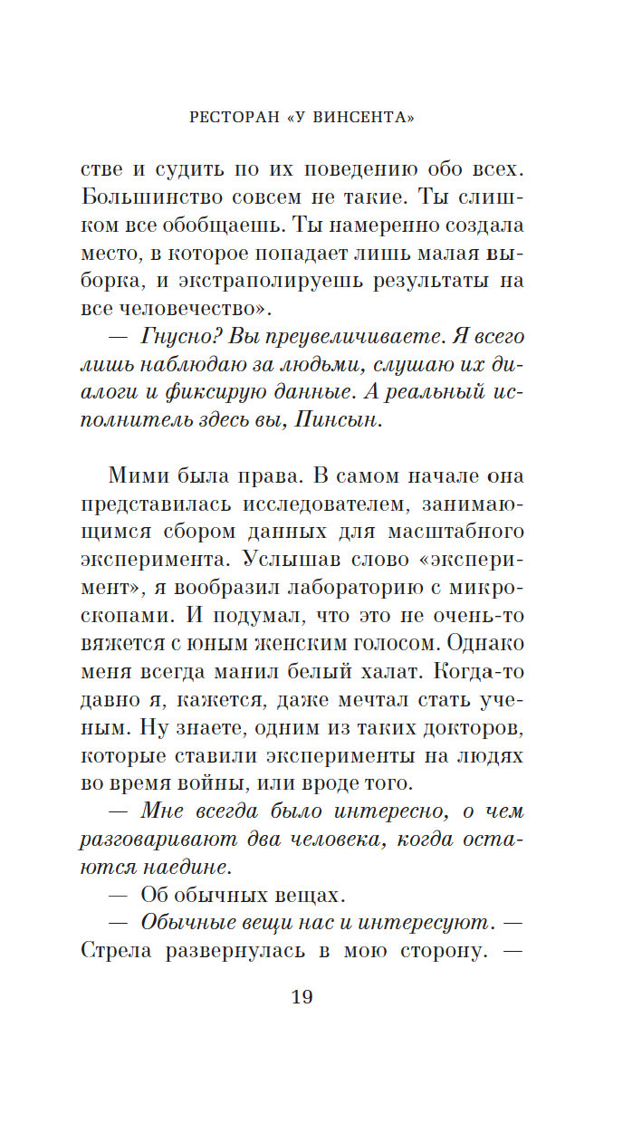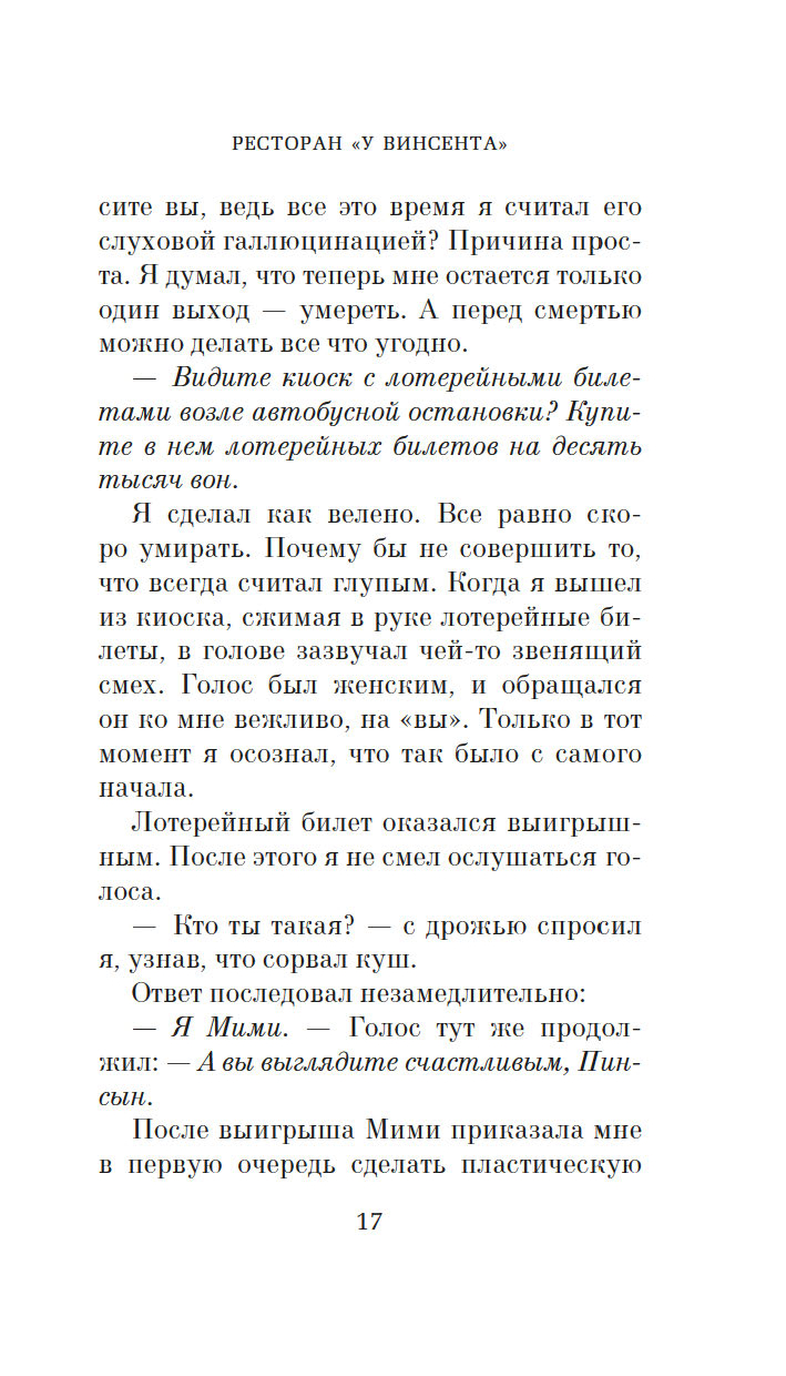 На девятом этаже безликой офисной башни среди клиник и фитнес-клубов скрывается крошечный, рассчитанный всего на восемь гостей ресторан. Здесь нет официантов, нет даже окон. В меню – самые посредственные блюда, а сидеть гостям и вовсе приходится, тесно прижавшись друг к другу. В одну роковую субботу здесь пересекаются судьбы бывшего директора школы и замученной домохозяйки, матери-тирана и ее взрослой дочери, двух некогда лучших подруг, а также начальницы и ее всезнайки-подчиненной. Пока гости припоминают друг другу давние обиды и раскрывают грязные секреты, владелец ресторана и по совместительству шеф-повар записывает каждое их слово – для исследования, порученного ему таинственным голосом по имени Мими. Но когда Мими решает перейти к финальной фазе, обычный обед превращается в смертельную игру. За каждым столиком выживет только один, и всего за десять минут четырем парам предстоит решить, кто будет этими счастливчиками…