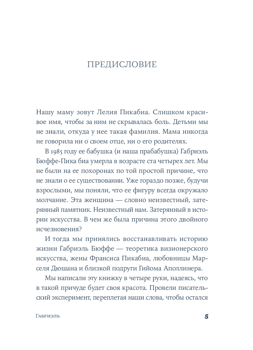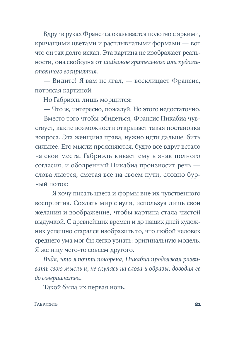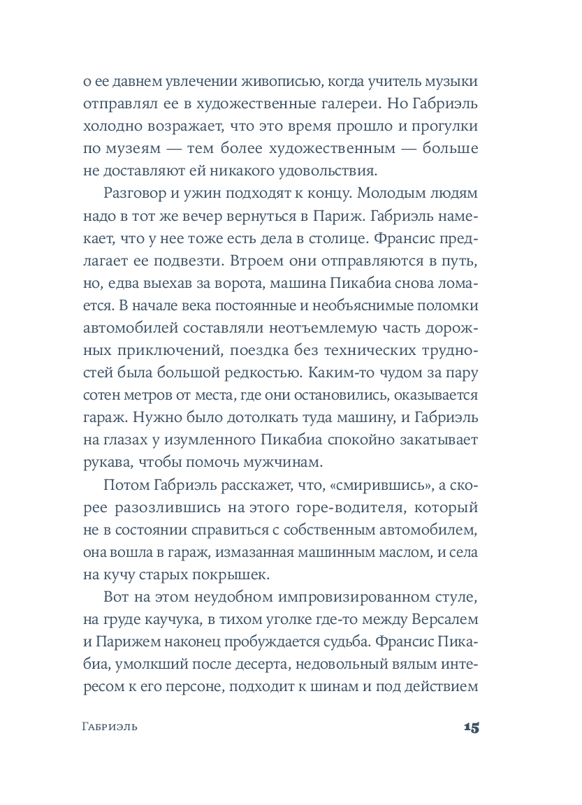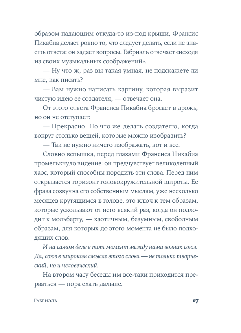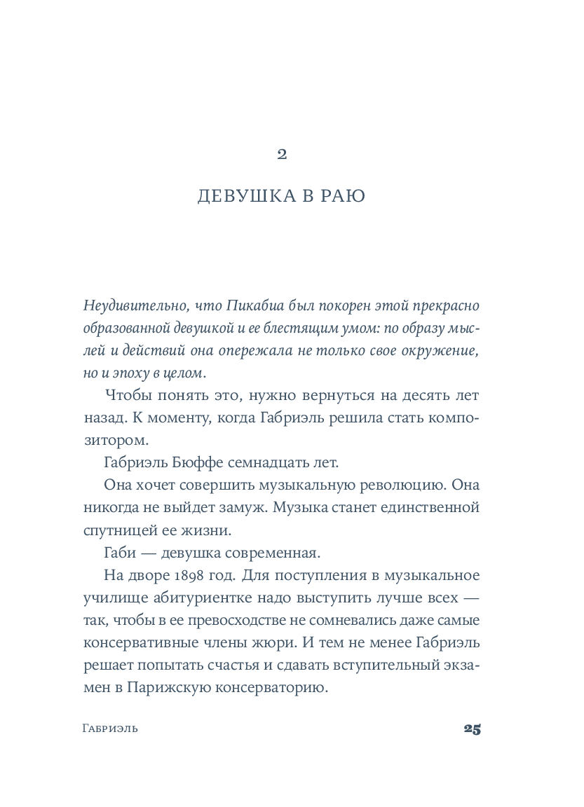Встретив молодого последователя импрессионистов Франсиса Пикабиа, Габи помогла ему сформулировать идею абстракции и решиться на перемену творческого пути. Их семейный и интеллектуальный союз стал одним из центров дадаизма. Габриэль окружали самые талантливые люди эпохи, ее острый ум и непростой характер восхищали и пугали одновременно. Для художника Марселя Дюшана она была источником вдохновения, а поэт Гийом Аполлинер обрел в ней друга и единомышленника. Но могла ли одаренная бунтарка остаться лишь женой эксцентричного гения?