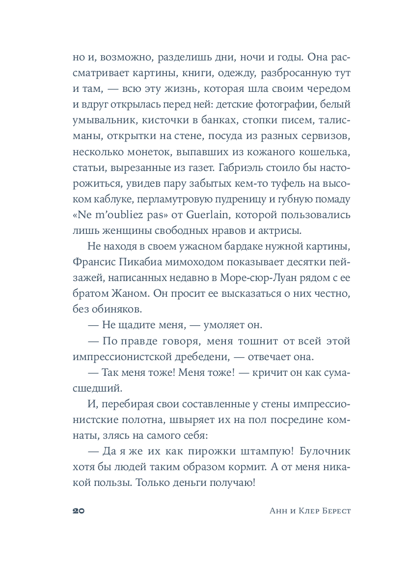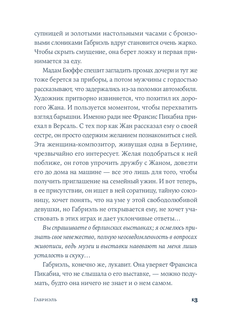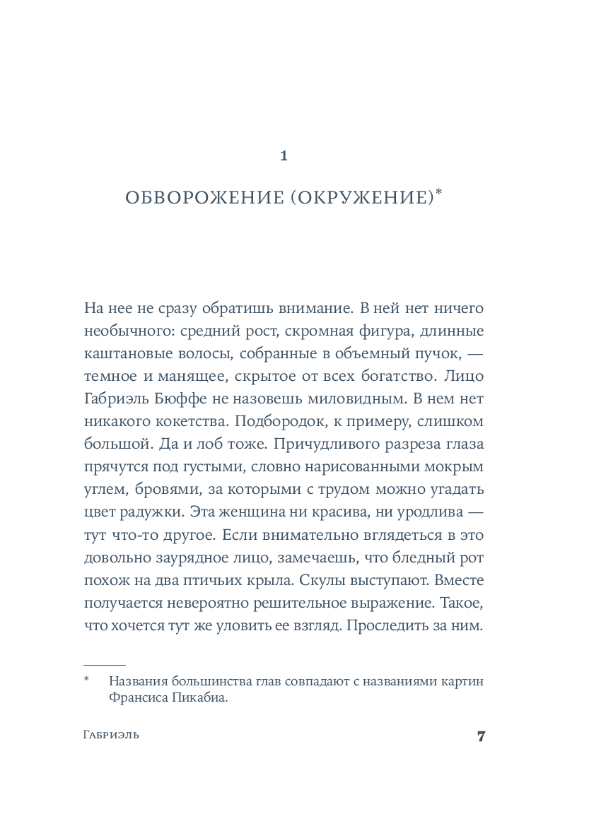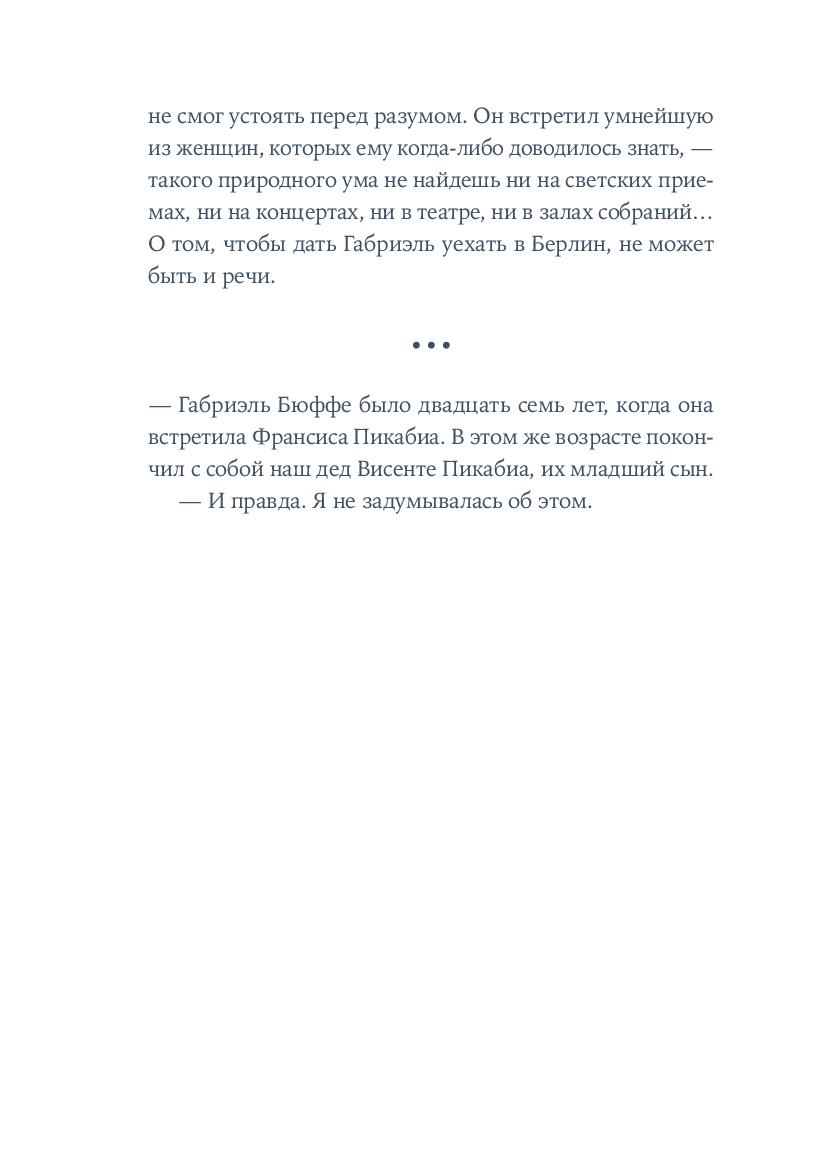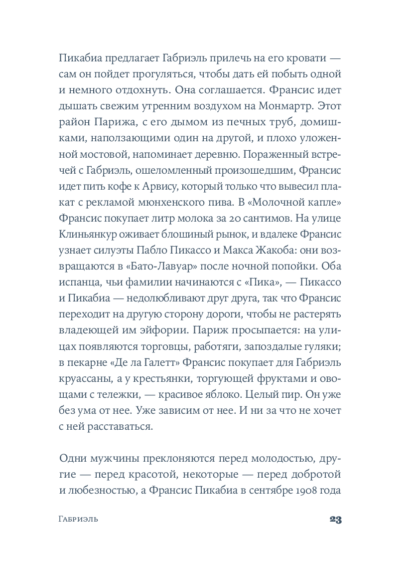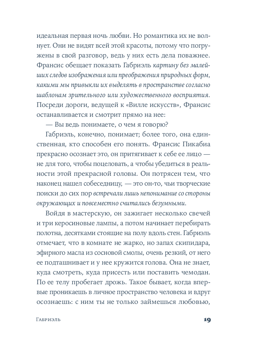 Встретив молодого последователя импрессионистов Франсиса Пикабиа, Габи помогла ему сформулировать идею абстракции и решиться на перемену творческого пути. Их семейный и интеллектуальный союз стал одним из центров дадаизма. Габриэль окружали самые талантливые люди эпохи, ее острый ум и непростой характер восхищали и пугали одновременно. Для художника Марселя Дюшана она была источником вдохновения, а поэт Гийом Аполлинер обрел в ней друга и единомышленника. Но могла ли одаренная бунтарка остаться лишь женой эксцентричного гения?