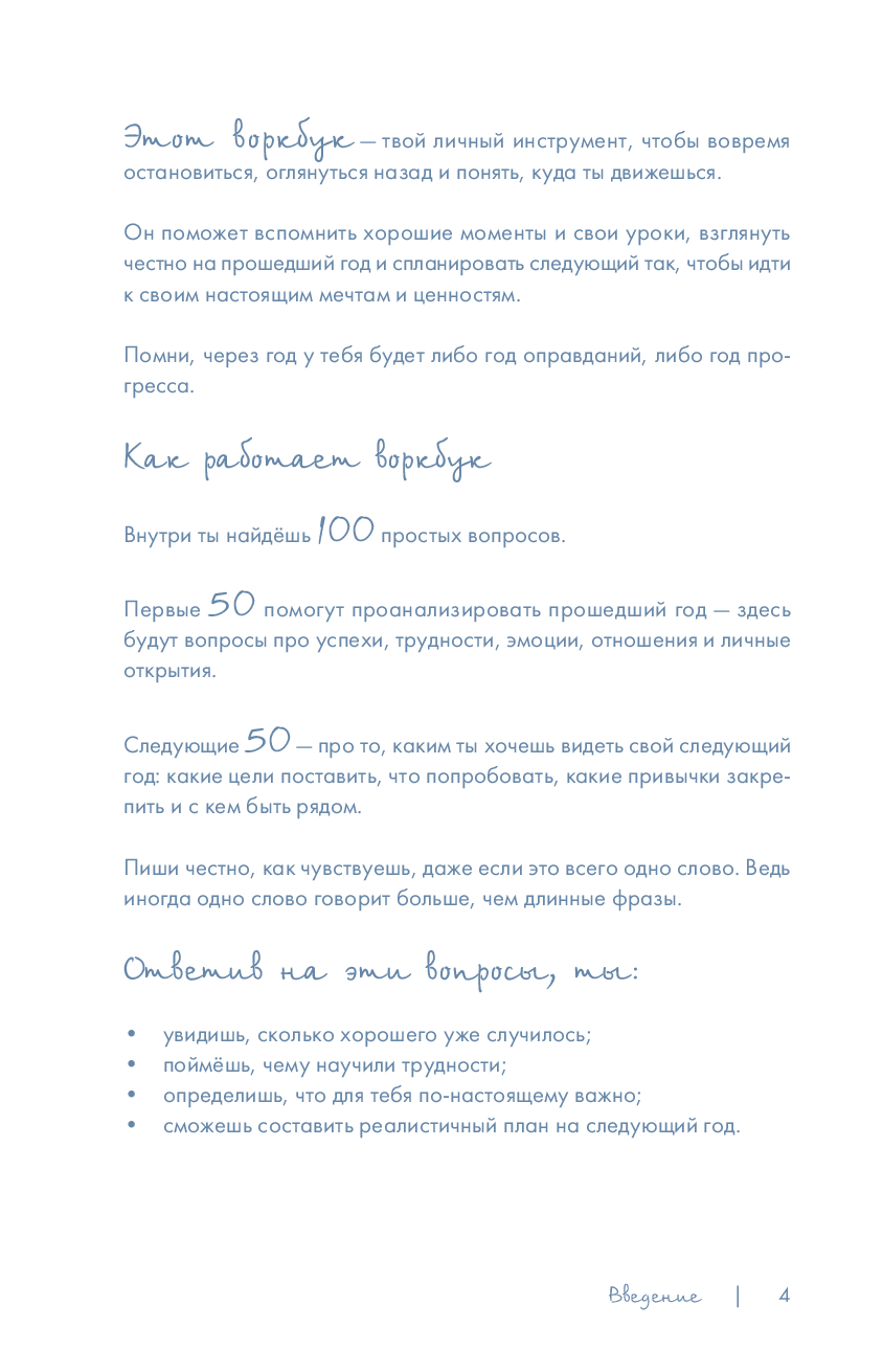 Ты держишь в руках не просто воркбук, а личный инструмент роста. Он поможет на минуту остановиться, оглянуться назад, понять, что уже получилось, и осознанно спланировать следующий шаг. Внутри – 100 простых и продуманных вопросов. Первые 50 – анализ года: успехи, ошибки, эмоции, отношения, личные открытия. Вторые 50 – проект твоего будущего: цели, привычки, эксперименты, поддержка, отдых. Каждый вопрос поможет разобраться, что для тебя по‑настоящему важно и составить реалистичный план на год из 5-7 главных целей.
