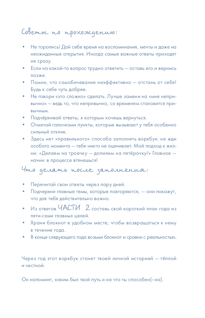 Пиши так, как чувствуешь – здесь нет правильных ответов. Через год этот блокнот станет твоей личной историей – тёплой, честной и живой – напомнит, каким был твой путь и на что ты способен.