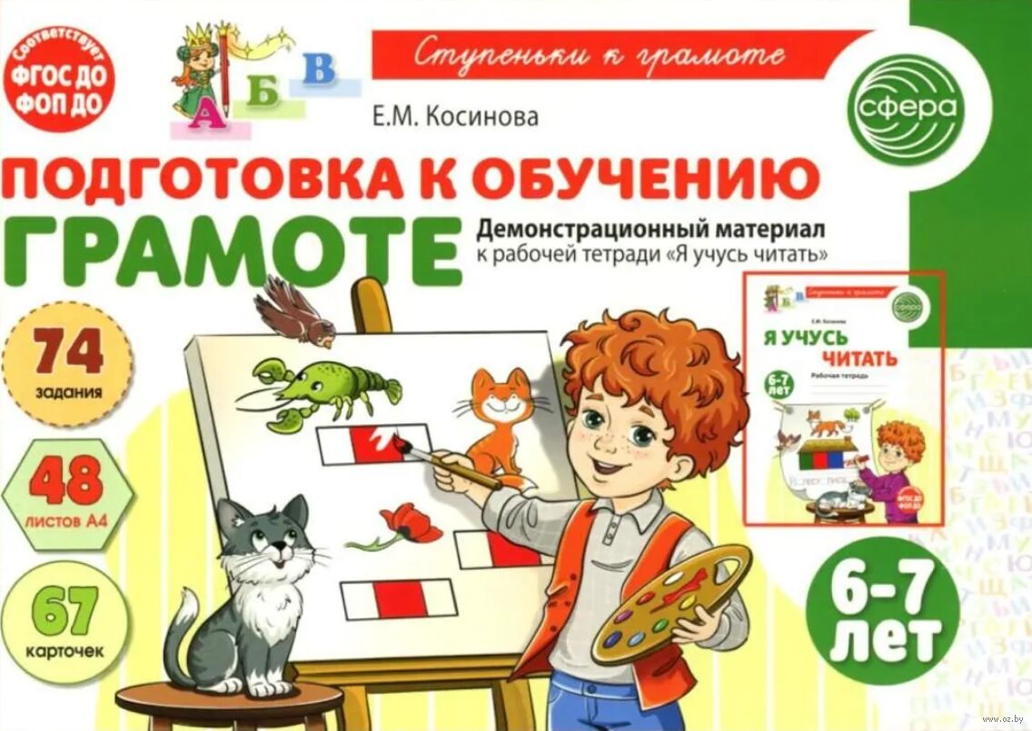 Это пособие можно использовать на групповых и подгрупповых занятиях. В его набор входят карточки большого размера с образцами букв и картинками, которые позволяют педагогу продемонстрировать детям, как выполнять задания, представленные в рабочей тетради, и сделать процесс обучения дошкольников более эффективным. Кроме этого в пособии содержатся карточки с материалом для чтения в игровом формате, которые можно использовать как во время занятий, так и после – для закрепления навыка слогослияния и автоматизации слогового чтения.