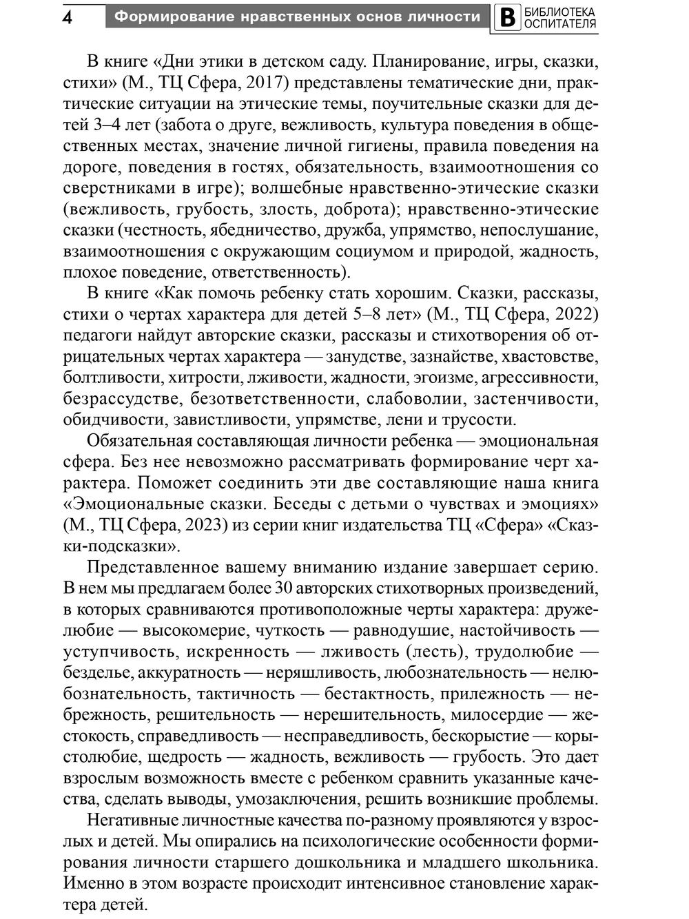 В книге представлено более 30 авторских стихотворных произведений, иллюстрирующих противоположные черты характера. Беседы на их основе направлены на профилактику развития и коррекцию негативных личностных качеств старших дошкольников и младших школьников.
