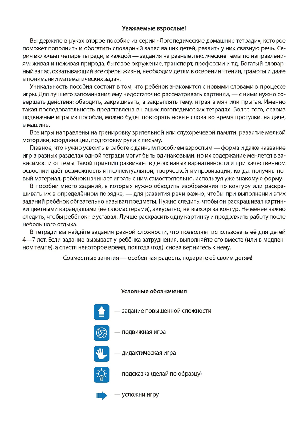 Данная тетрадь – вторая из пяти: в каждой из них даны игровые задания для детей, скомпонованные по лексическим темам, объединённым одним направлением (растения, животные, бытовое окружение, транспорт и т. д.). Для взрослых даны методические рекомендации.