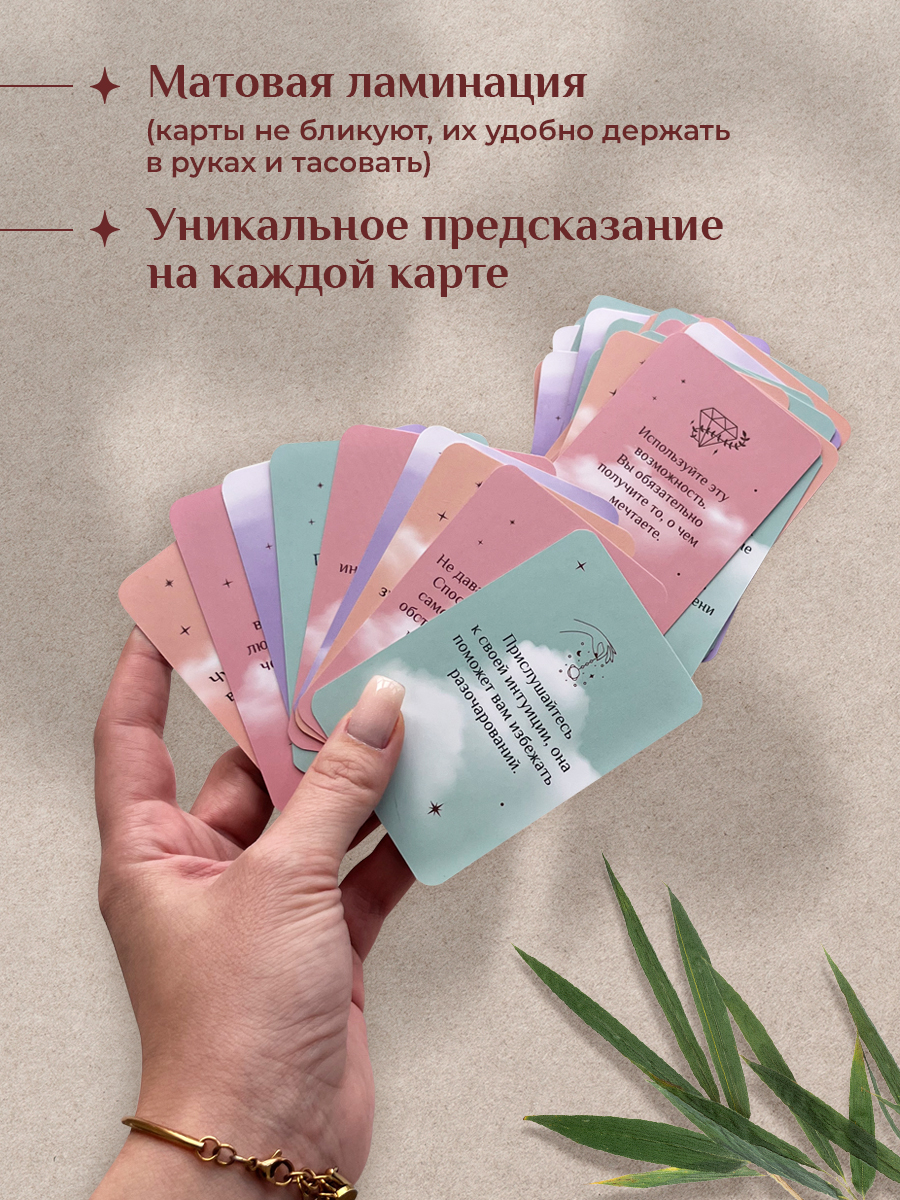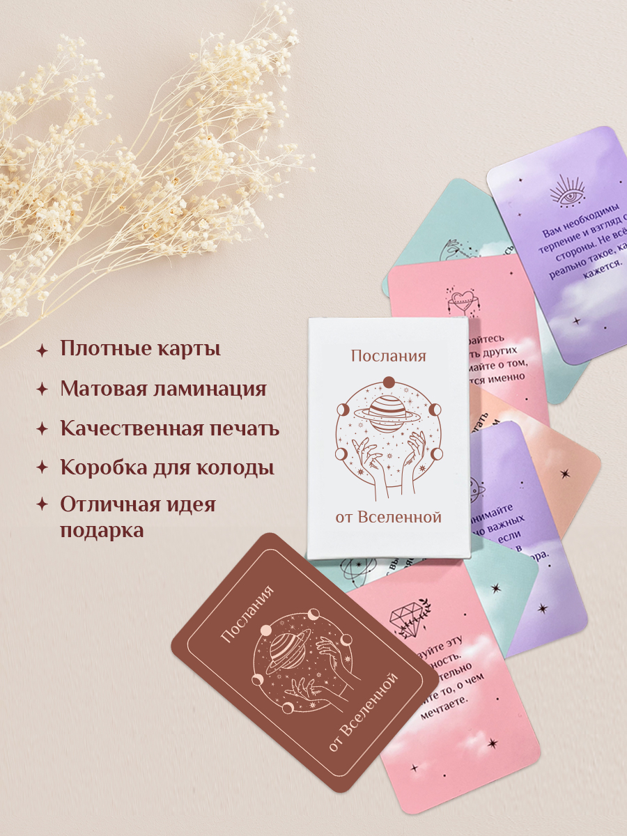 Метафорические карты с посланиями от Вселенной – это универсальная колода МАК карт с готовыми текстовыми посланиями. В каждой карте – осознанный ответ, поддержка или направление на день. Карты подходят для формата «карта дня», а также для работы с вопросами: достаточно задать запрос, вытянуть карту и получить послание.