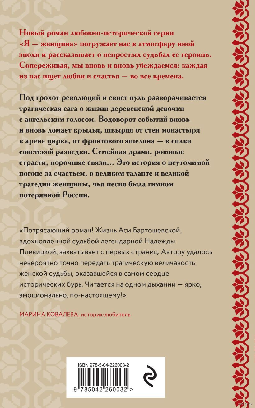 На изломе эпох, под грохот революций и свист пуль, разворачивается трагическая сага о жизни деревенской девочки с ангельским голосом. Водоворот исторических событий вновь и вновь ломает крылья, швыряя от стен монастыря к арене цирка, от фронтового эшелона – в силки советской разведки. Семейная драма, роковые страсти, порочные связи… Это история о неутомимой погоне за счастьем, о великом таланте и великой трагедии женщины, чья песня была гимном потерянной России.