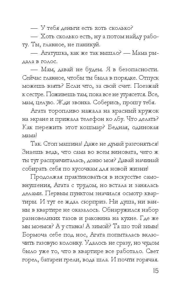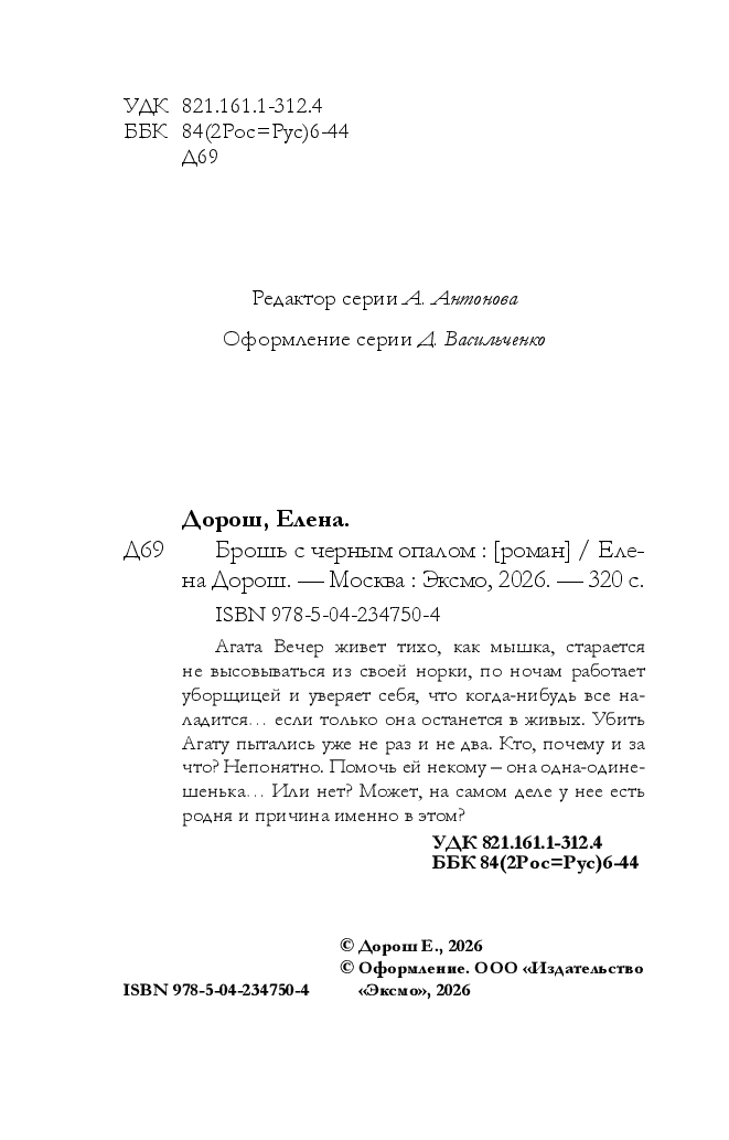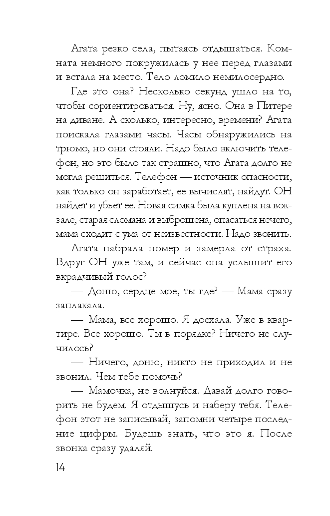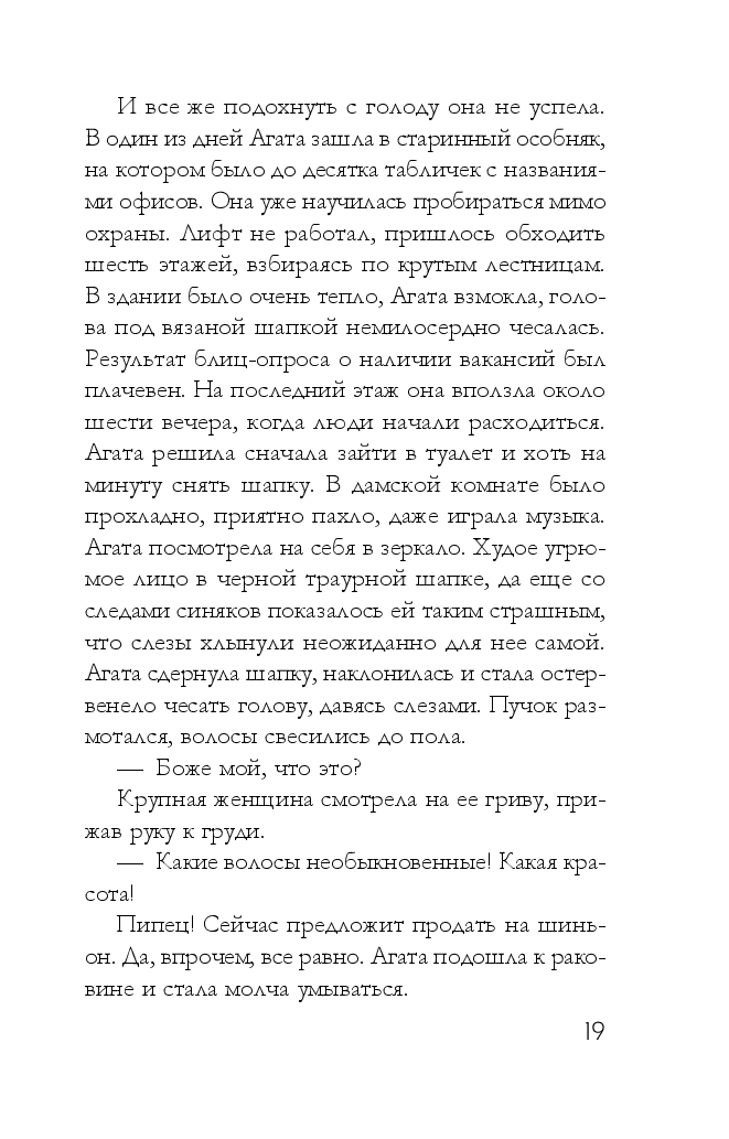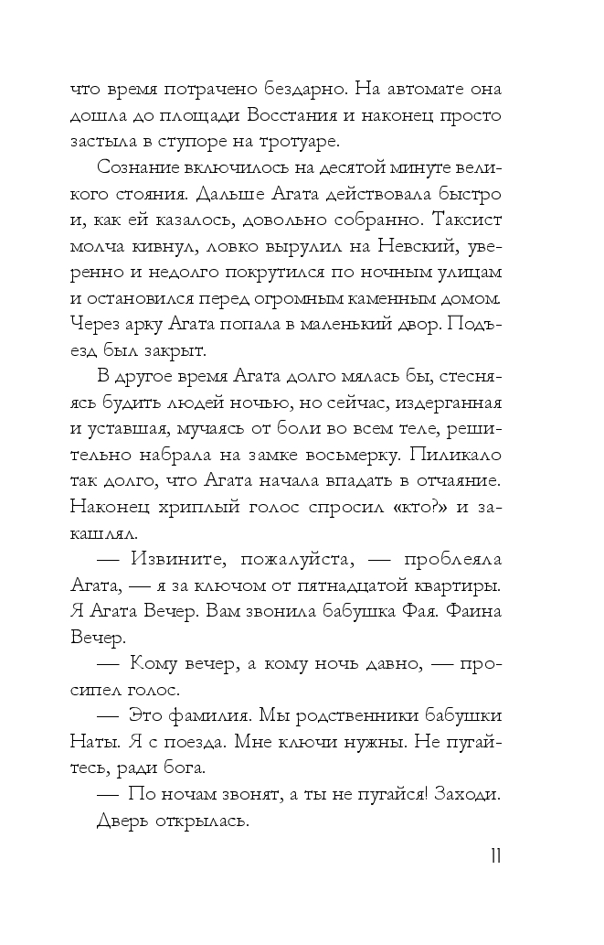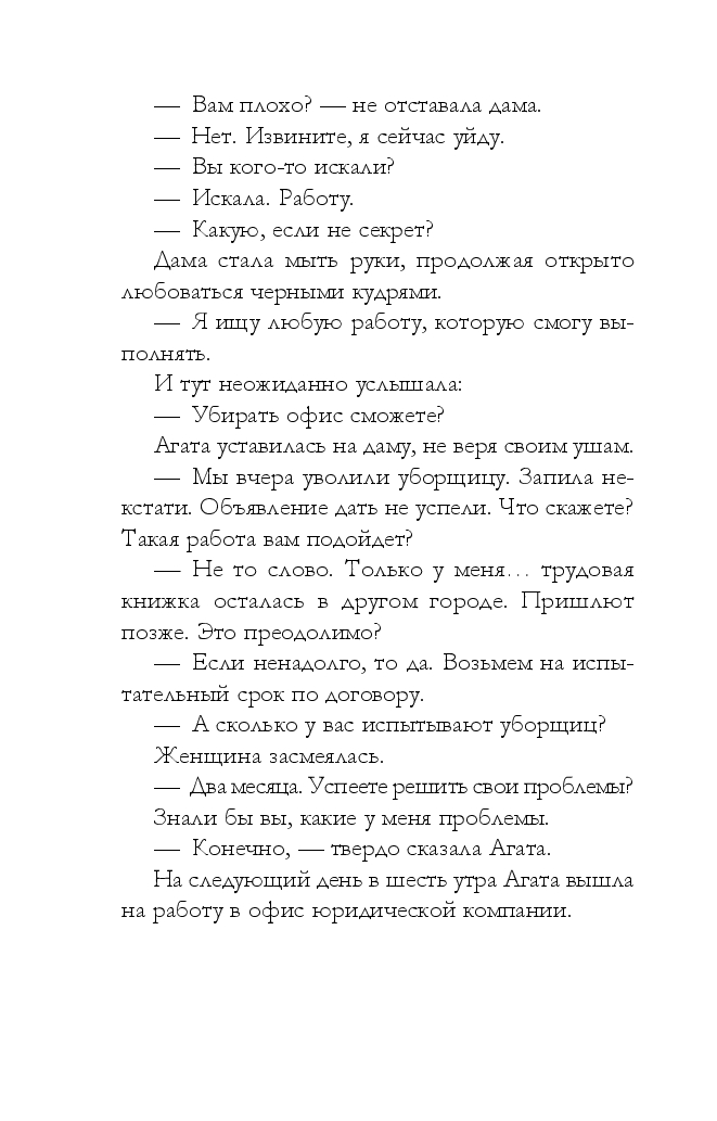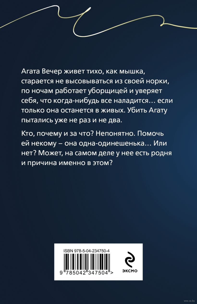 Агата Вечер живет тихо, как мышка, старается не высовываться из своей норки, по ночам работает уборщицей и уверяет себя, что когда-нибудь все наладится… если только она останется в живых. Убить Агату пытались уже не раз и не два. Кто, почему и за что? Непонятно. Помочь ей некому – она одна-одинешенька… Или нет? Может, на самом деле у нее есть родня и причина именно в этом?