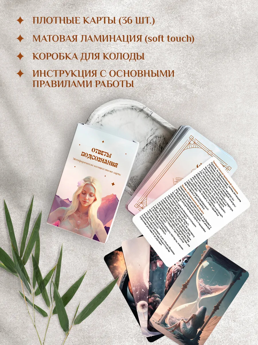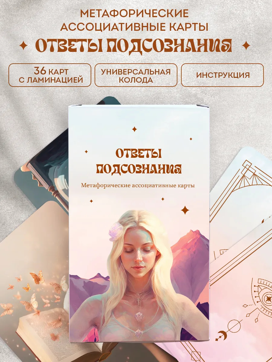 Метафорические карты "Ответы подсознания" – это колода из 36 ассоциативных карт, созданная для работы с внутренними вопросами, эмоциями и состояниями. Каждая карта содержит образ, который помогает подсознанию подсказать ответ там, где логика не срабатывает.
