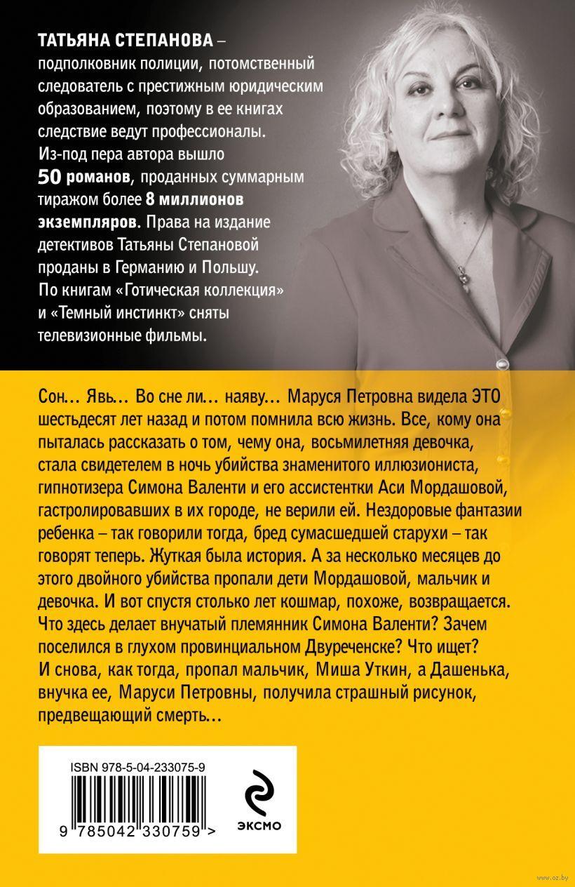 Сон… Явь… Во сне ли… наяву.. Маруся Петровна видела ЭТО шестьдесят лет назад и потом помнила всю жизнь. Все, кому она пыталась рассказать то, чему она, восьмилетняя девочка, стала свидетелем в ночь убийства знаменитого иллюзиониста, гипнотизера Симона Валенти и его асссистентки Аси Мордашовой, гастролировавших в их городе, не верили ей. Нездоровые фантазии ребенка – так говорили тогда, бред сумасшедшей старухи – так говорят теперь. Жуткая была история. А за несколько месяцев до этого двойного убийства пропали дети Мордашовой, мальчик и девочка. И вот спустя столько лет кошмар, похоже, возвращается. Что здесь делает внучатый племянник Симона Валенти? Зачем поселился в глухом провинциальном Двуреченске? Что ищет? И снова, как тогда, пропал мальчик Миша Уткин, а Дашенька, внучка ее, Маруси Петровны, получила страшный рисунок, предвещающий смерть…