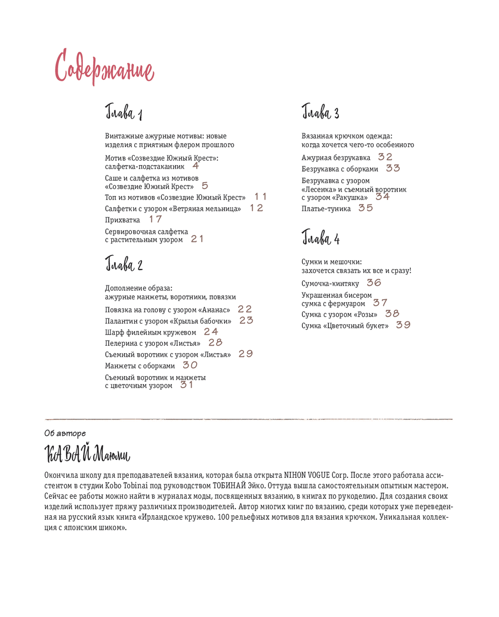 Представьте, что вы держите в руках ключ в утонченный мир вязаного кружева, но не через сложные мастер-классы, а через японское чувство изящной простоты. Знаменитый автор Маюми Каваи станет вашим личным проводником в этом путешествии: в этом сборнике собрано все для идеального старта. Это уникальное издание объединяет в себе признанные во всем мире хиты мастера и эксклюзивные проекты, созданные специально для этой книги, – такое сокровище вы не найдете больше нигде.