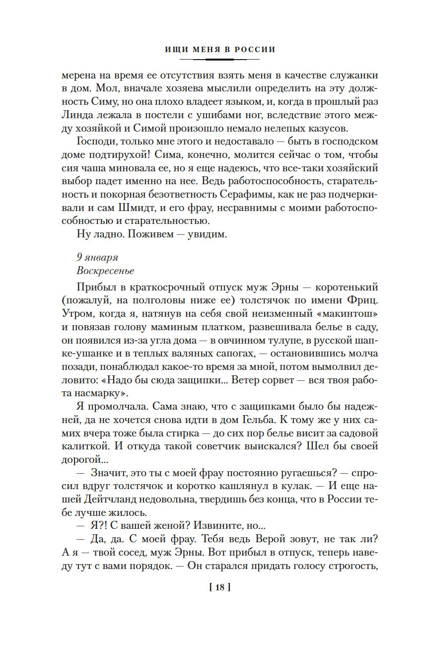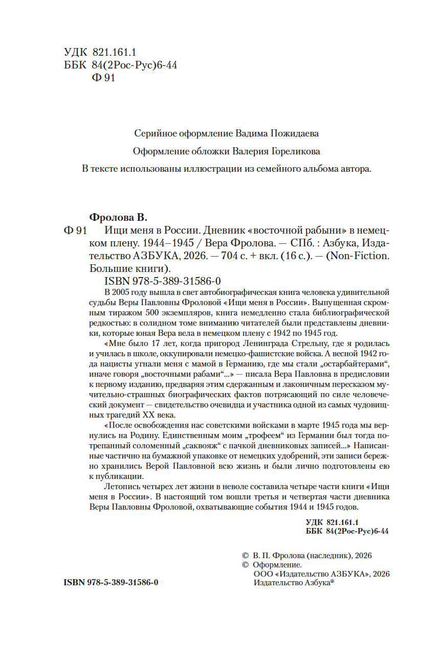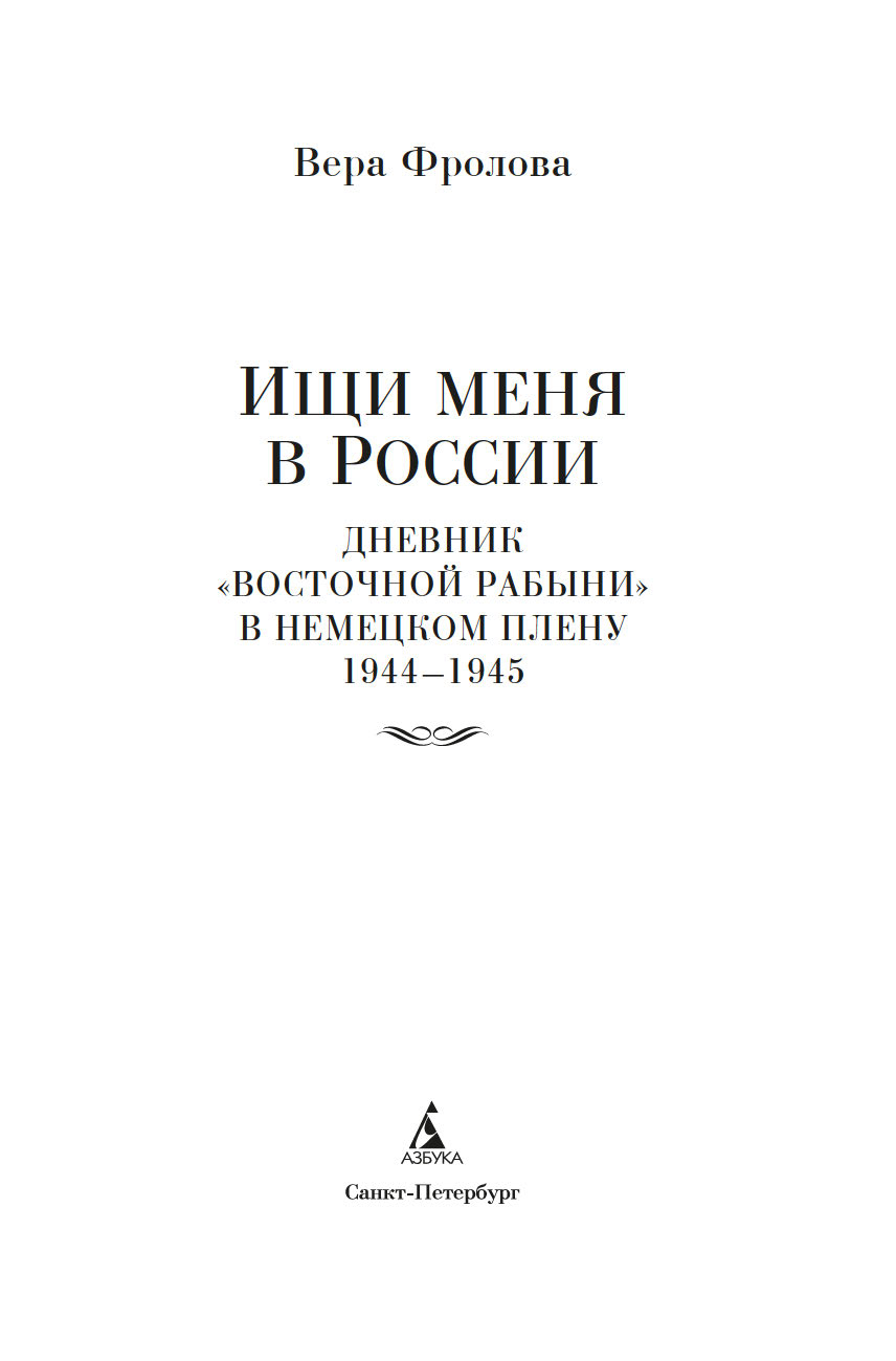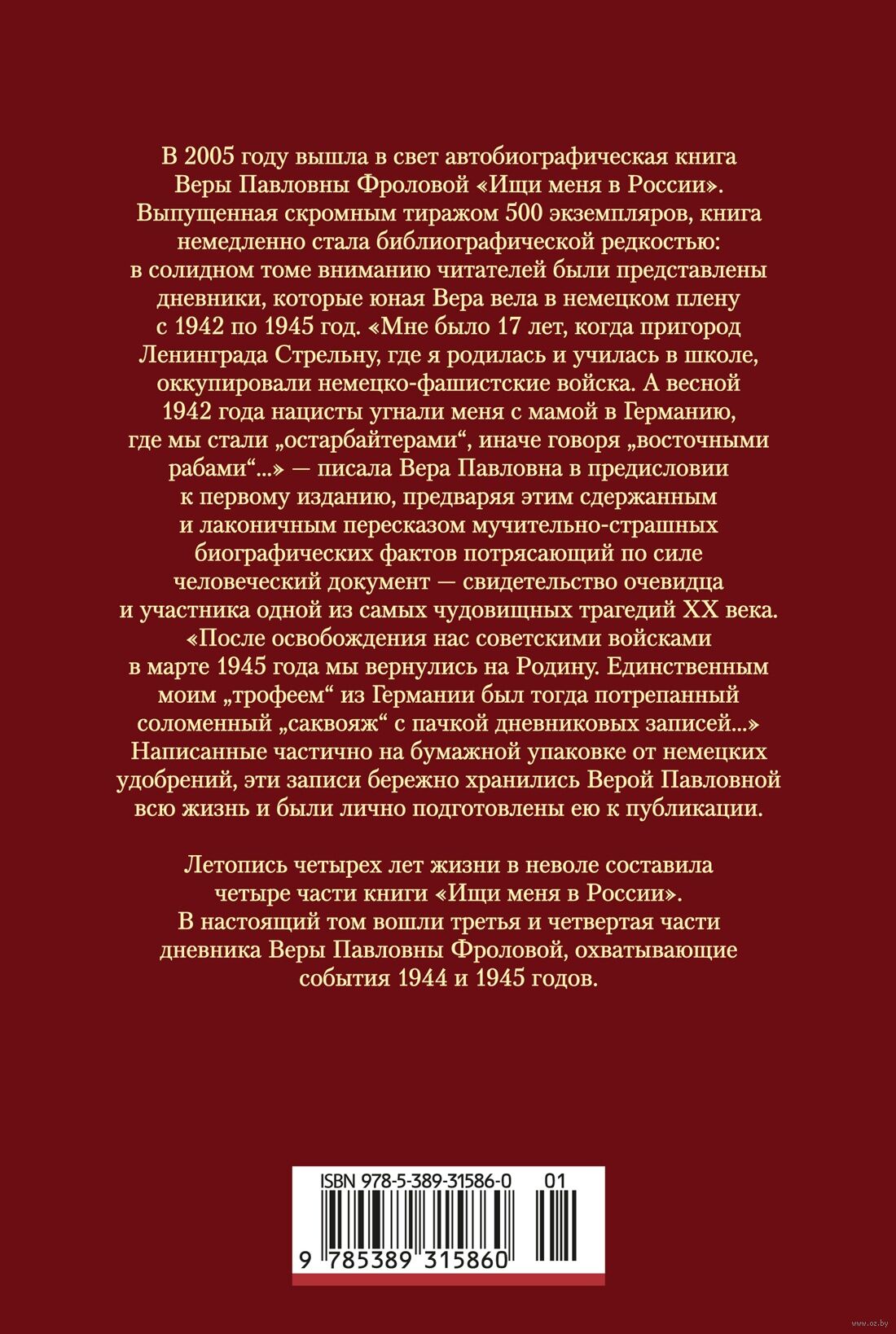 Летопись четырех лет жизни в неволе составила четыре части книги "Ищи меня в России". В настоящий том вошли третья и четвертая части дневника Веры Павловны Фроловой, охватывающие события 1944 и 1945 годов.