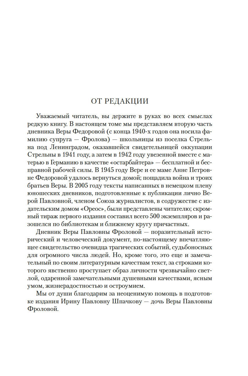 "После освобождения нас советскими войсками в марте 1945 года мы вернулись на Родину. Единственным моим "трофеем" из Германии был тогда потрепанный соломенный "саквояж" с пачкой дневниковых записей..." Написанные частично на бумажной упаковке от немецких удобрений, эти записи бережно хранились Верой Павловной всю жизнь и были лично подготовлены ею к публикации.
