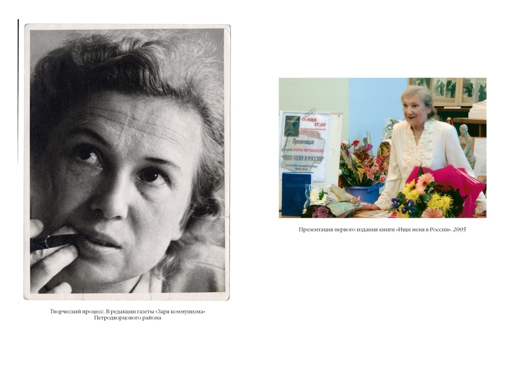 В 2005 году вышла в свет автобиографическая книга человека удивительной судьбы Веры Павловны Фроловой "Ищи меня в России". Выпущенная скромным тиражом 500 экземпляров, книга немедленно стала библиографической редкостью: в солидном томе вниманию читателей были представлены дневники, которые юная Вера вела в немецком плену с 1942 по 1945 год.