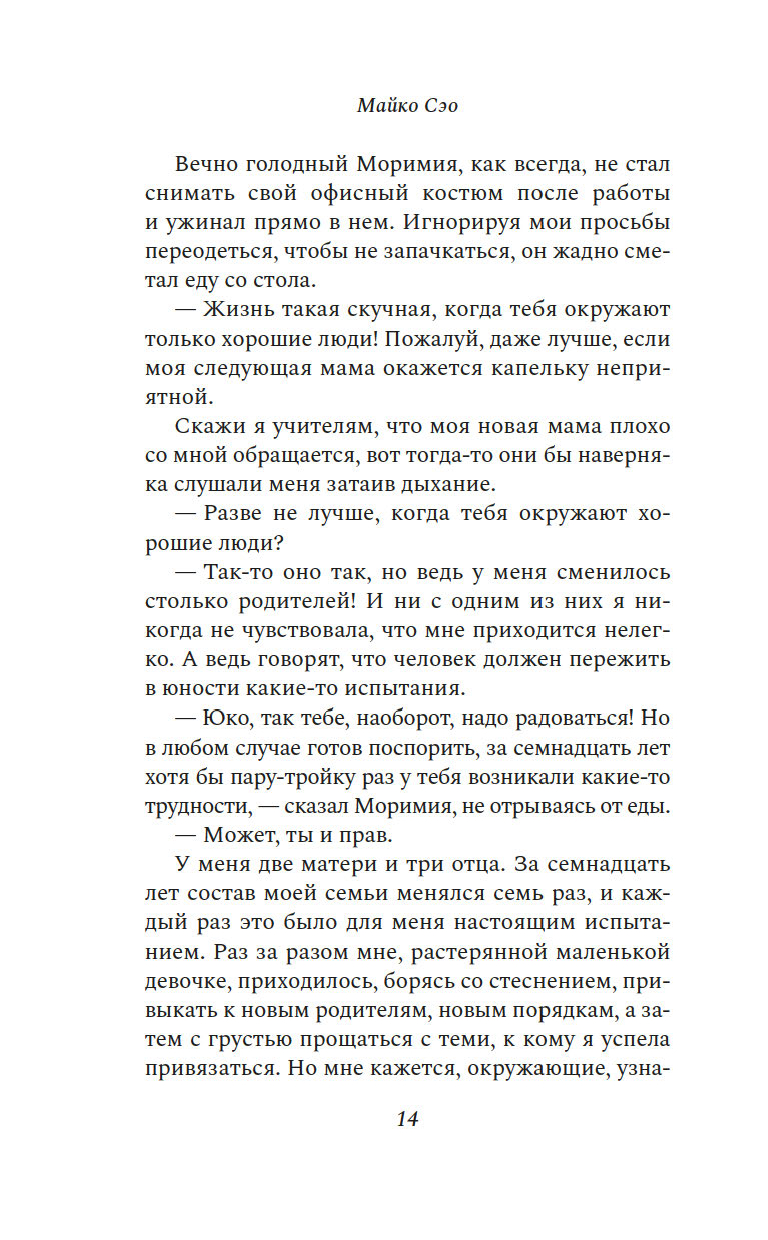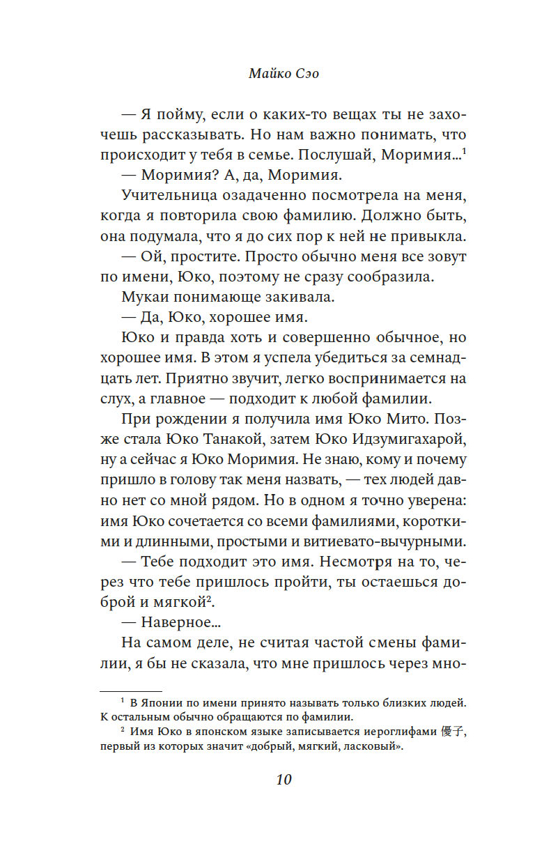 "При рождении я получила имя Юко Мито. Позже стала Юко Танакой, затем Юко Идзумигахарой, ну а сейчас я Юко Моримия. Не знаю, кому и почему пришло в голову так меня назвать, – тех людей давно нет со мной рядом. Но в одном я точно уверена: имя Юко сочетается со всеми фамилиями…"