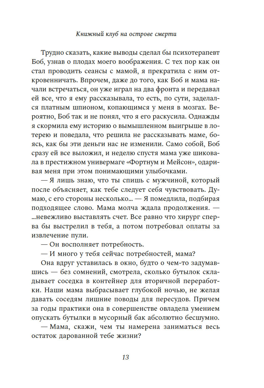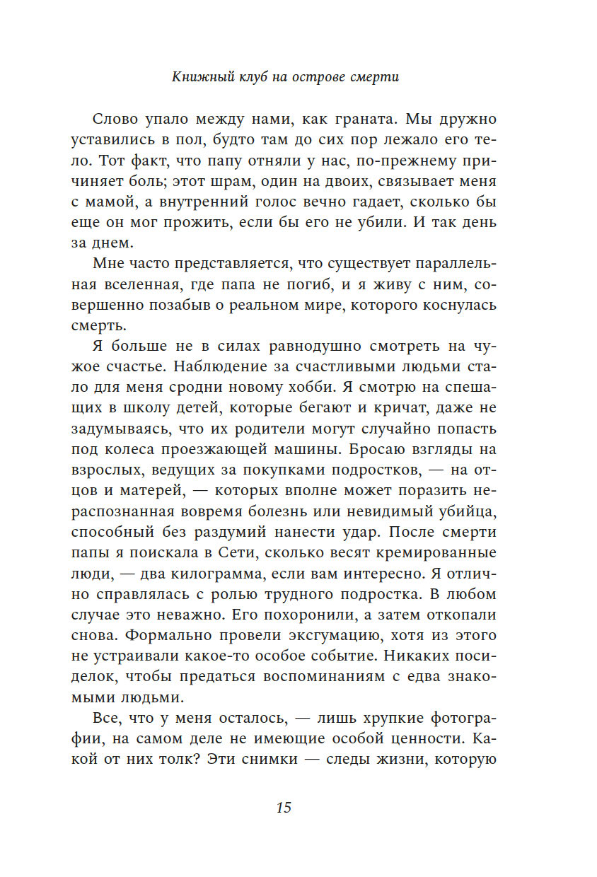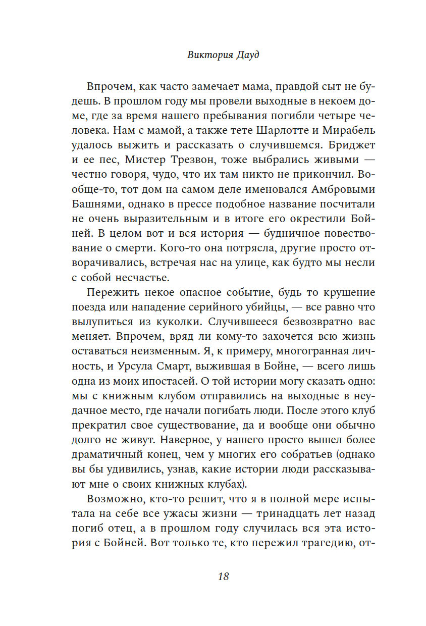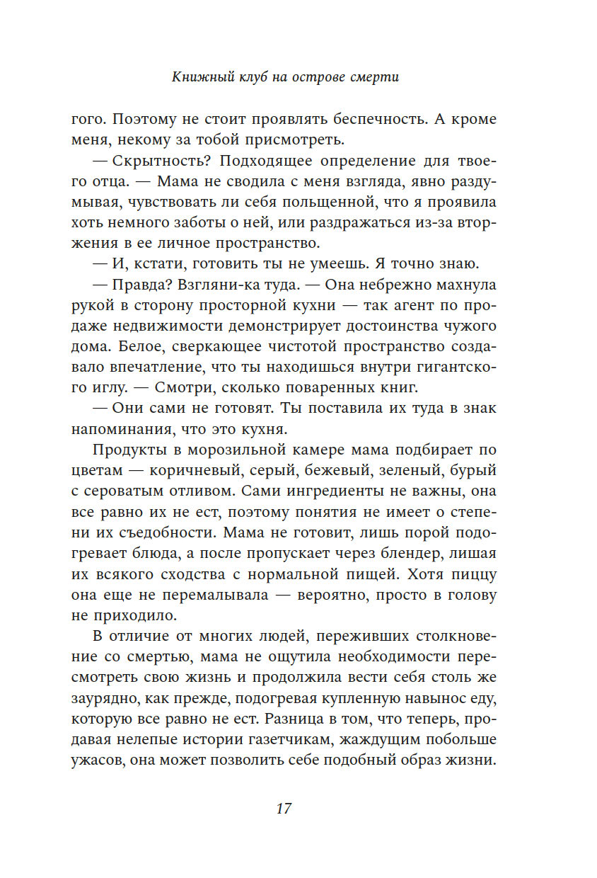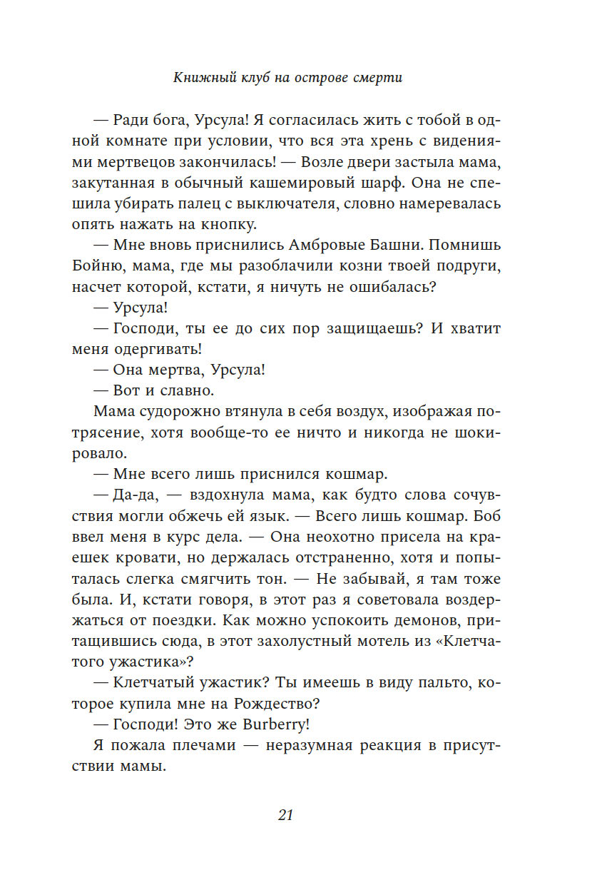 "Книжный клуб на острове смерти" – это волнующий, мрачный, фонтанирующий черным юмором, уютный детектив, в котором у главной героини, Урсулы Смарт, есть все, чтобы завоевать сердца читателей: едкий ум, язвительный характер, травмирующее детство, токсичные отношения с матерью и, конечно же, способность всегда и везде попадать на крючок убийцы.