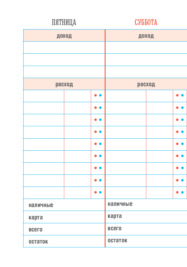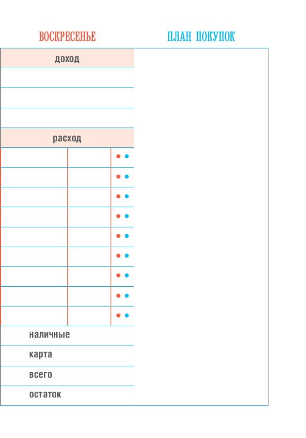 Мы создали для вас максимально продуманную концепцию для экономии ваших денег. Заполняйте странички, считайте доходы и расходы, отмечайте, что вы купили и как расплатились. Подводите итоги недели, месяца и, конечно, планируйте вперед.
