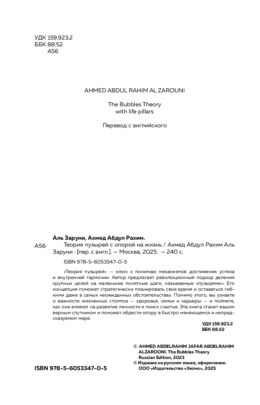 "Теория пузырей" – ключ к понимаю механизмов достижения успеха и внутренней гармонии. Автор предлагает революционный подход деления крупных целей на маленькие понятные шаги, называемые "пузырями". Его концепция поможет стратегически планировать свое время и оставаться гибкими в даже в самых неожиданных обстоятельствах. Помимо этого, вы узнаете про важность жизненных столпов – здоровья, семьи и карьеры – и поймете, как они влияют на развитие личности и поиск счастья. Эта книга станет вашим верным спутником и поможет обрести опору в быстроменяющемся и непредсказуемом мире.