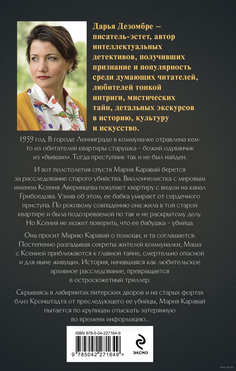 Виолончелистка с мировым именем Ксения Аверинцева покупает квартиру с видом на канал Грибоедова. Узнав об этом, ее бабка умирает от сердечного приступа. По роковому совпадению она жила в той старой квартире и была подозреваемой по так и не раскрытому делу. Но Ксения не может поверить, что ее бабушка – убийца. Она просит Марию Каравай о помощи, и та соглашается. Постепенно разгадывая секреты жителей коммуналки, Маша с Ксенией приближаются к главной тайне, смертельно опасной и для ныне живущих. История, начавшаяся как любительское архивное расследование, превращается в остросюжетный триллер. Скрываясь в лабиринтах питерских дворов и на старых фортах близ Кронштадта от преследующего ее убийцы, Мария Каравай пытается по крупицам отыскать затерянную во времени информацию...