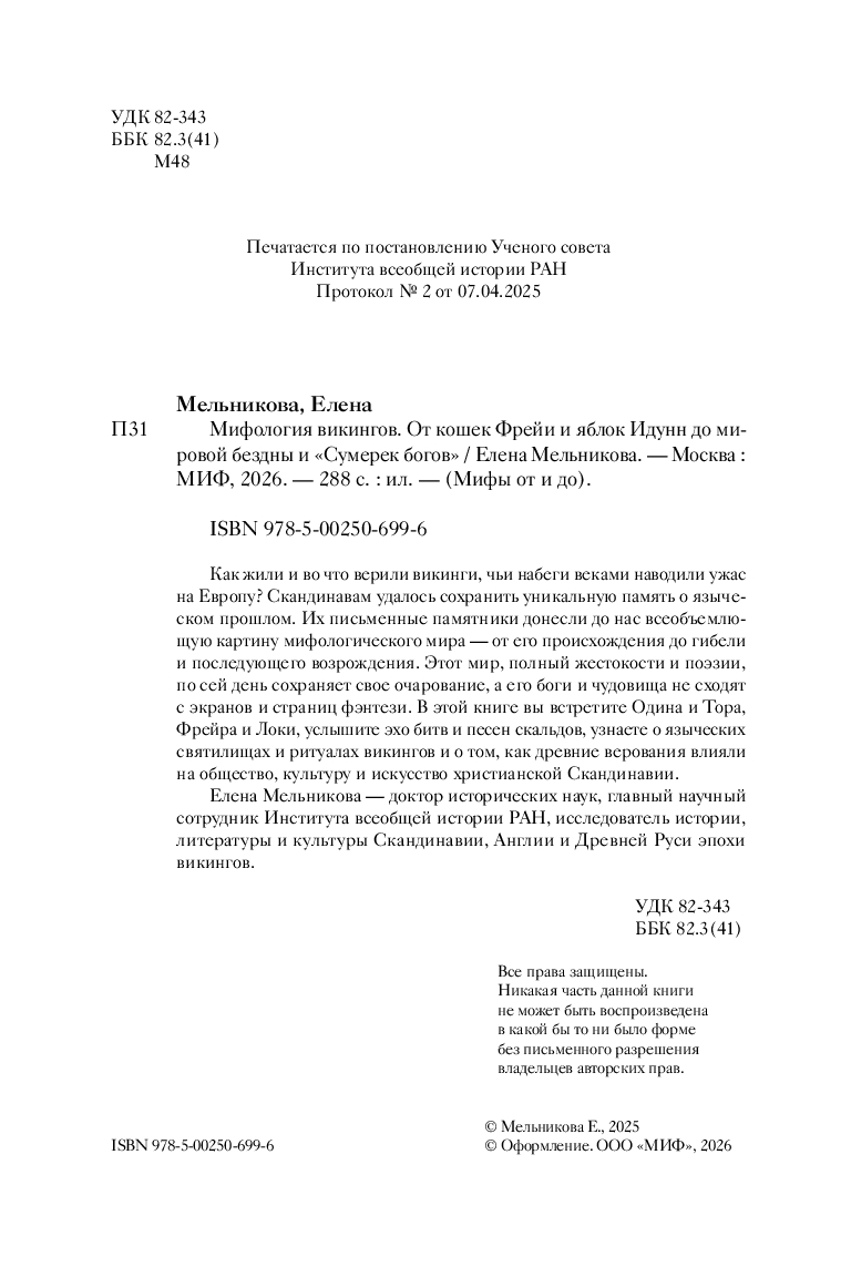 Этот мир, полный жестокости и поэзии, по сей день сохраняет свое очарование, а его боги и чудовища не сходят с экранов и страниц фэнтези. В книге вы встретите Одина и Тора, Фрейра и Локи, услышите эхо битв и песен скальдов, узнаете о языческих святилищах и ритуалах викингов и о том, как древние верования влияли на общество, культуру и искусство христианской Скандинавии.