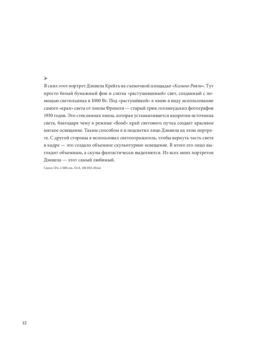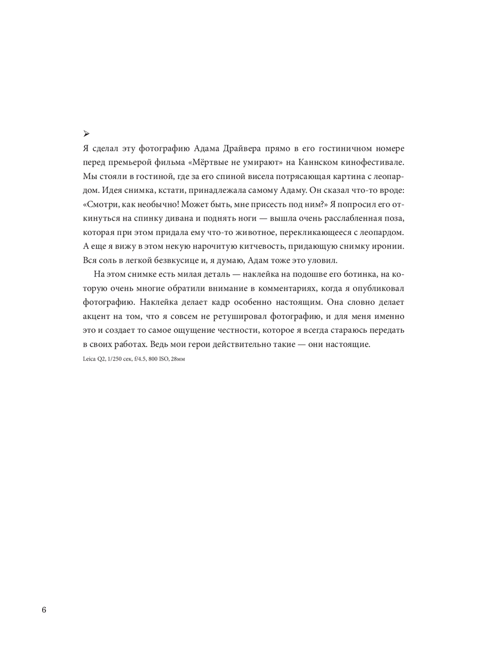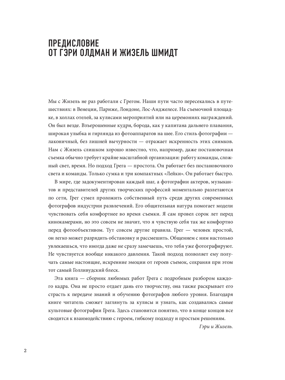 Хотите увидеть, как выглядят великие актеры вне сцены? Эта книга – настоящий backstage, только в фотографии. Легендарный фотограф Грег Уильямс рассказывает, как создаются шедевры, – как настраивать камеру при недостаточном количестве света или в движении, когда лучше снимать людей во время больших мероприятий, как поймать "тот самый кадр". Благодаря этой книге вы сможете увидеть потрясающе красивые снимки Зендаи, Кендалл Дженнер, Брэда Питта, Хоакина Феникса, Леди Гаги, Дуа Липы, Роберта Дауни-Младшего и других знаменитостей, и узнаете про них то, что было скрыто от наших глаз, но удалось разглядеть Грегу Уильямсу через объектив его фотоаппарата.