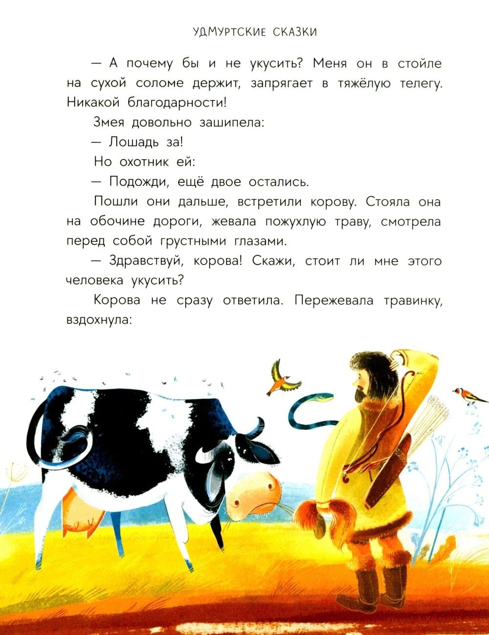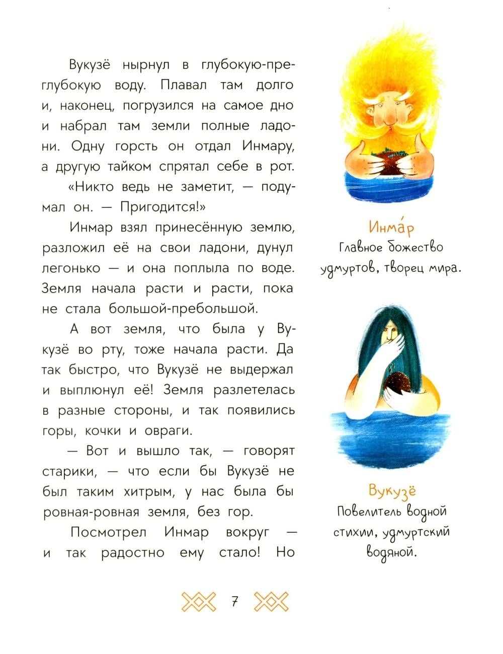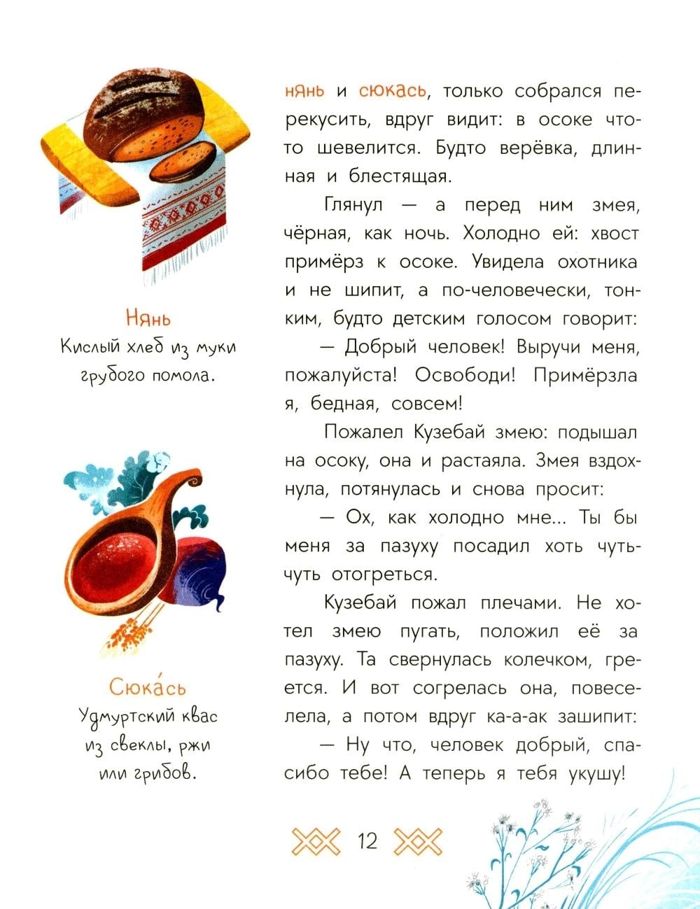 Кто такие Инмар и Вукузё, как называются удмуртские хлеб и квас и кто охраняет лесных животных? Вы прочтёте историю о находчивой кошке и её хозяине-охотнике; о храбром мальчике Тукташе, который не испугался тёмного леса и отправился на поиски своей лошадки; о водяном хозяине вумурте и охранителе лесов и полей Нюлэсмурте.