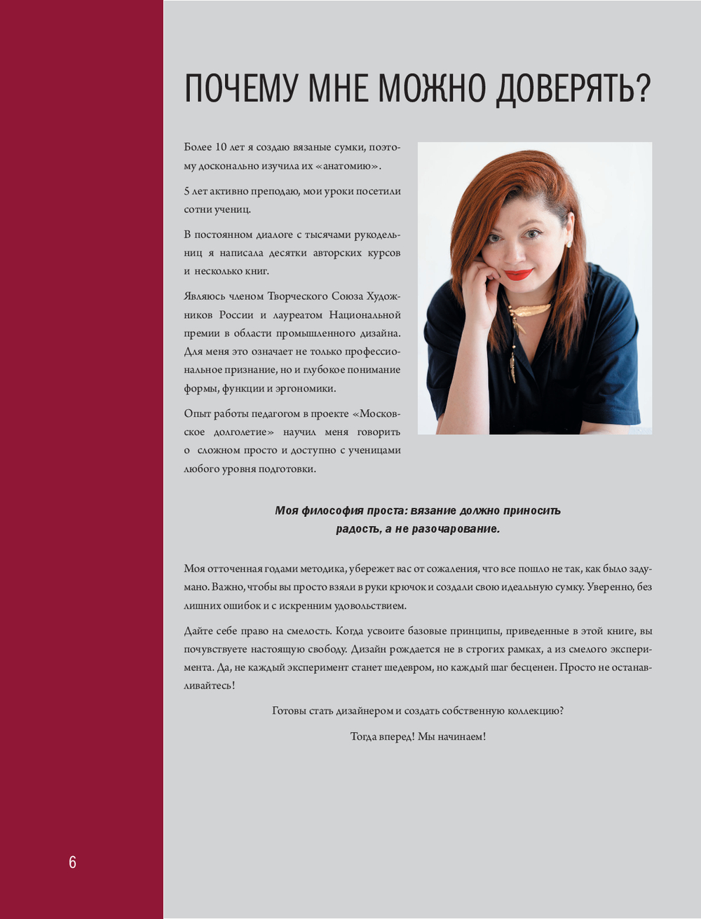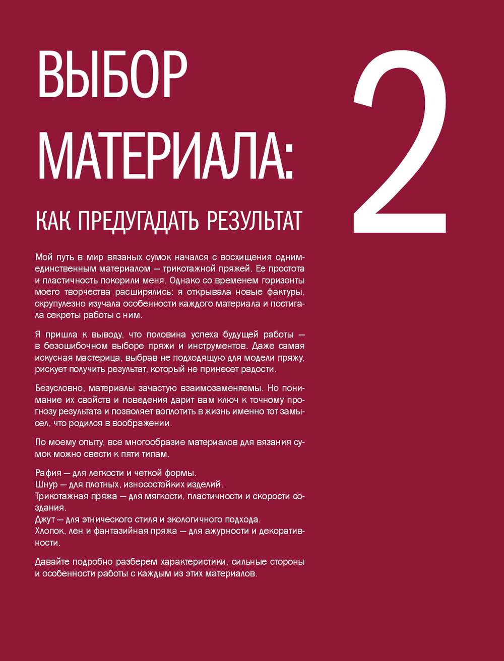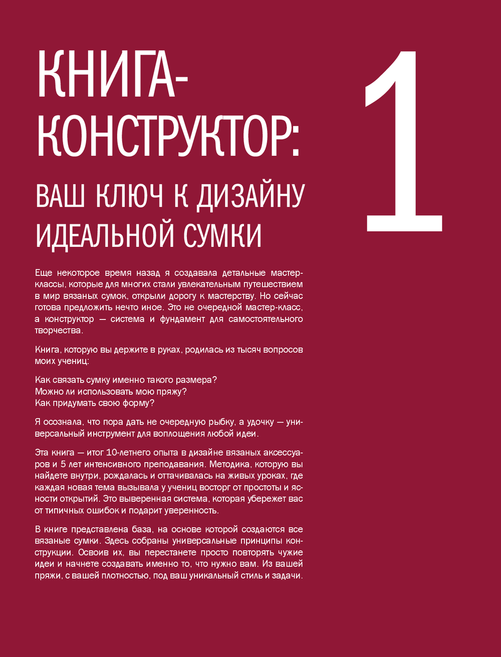 В книге представлена авторская система конструирования вязаных сумок на основе простых геометрических форм. Вы разберетесь в типах сумок и их назначении, научитесь выбирать материалы и инструменты, работать с донышками, стенками, клапанами, фурнитурой и подкладкой. Эта книга станет вашим рабочим инструментом на долгие годы – к ней захочется возвращаться снова и снова, чтобы создавать новые модели, экспериментировать и развивать собственный стиль в вязании аксессуаров.