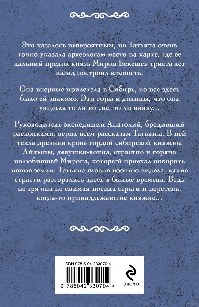 Это казалось невероятным, но Татьяна очень точно указала археологам место на карте, где ее дальний предок, князь Мирон Бекешев, триста лет назад построил крепость. Она впервые прилетела в Сибирь, но все здесь было ей знакомо. Эти горы и долины, что она увидела то ли во сне, то ли наяву… Руководитель экспедиции Анатолий, бредивший раскопками, верил всем рассказам Татьяны. В ней текла древняя кровь гордой сибирской княжны Айдыны, девушки-воина, страстно и горячо полюбившей Мирона, который приехал покорять новые земли. Татьяна словно воочию видела, какие страсти разгорались здесь в былые времена. Ведь не зря она не снимая носила серьги и перстень, когда-то принадлежавшие княжне…