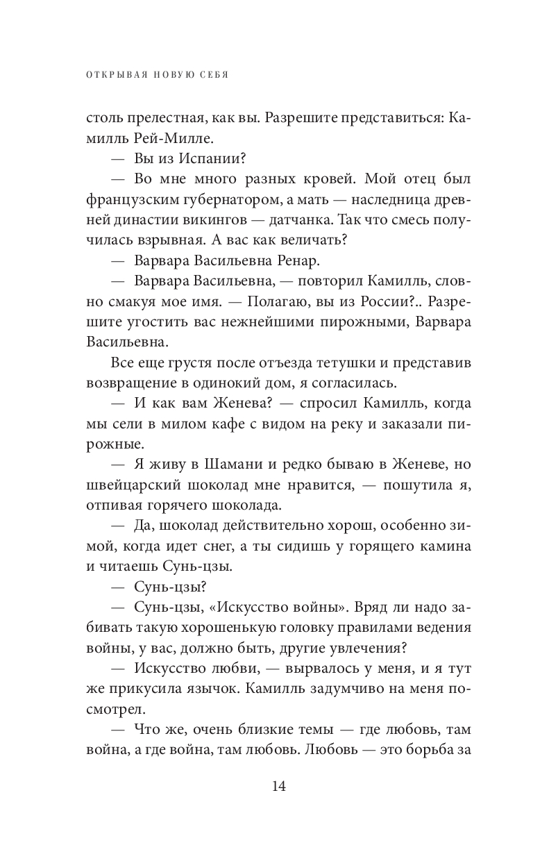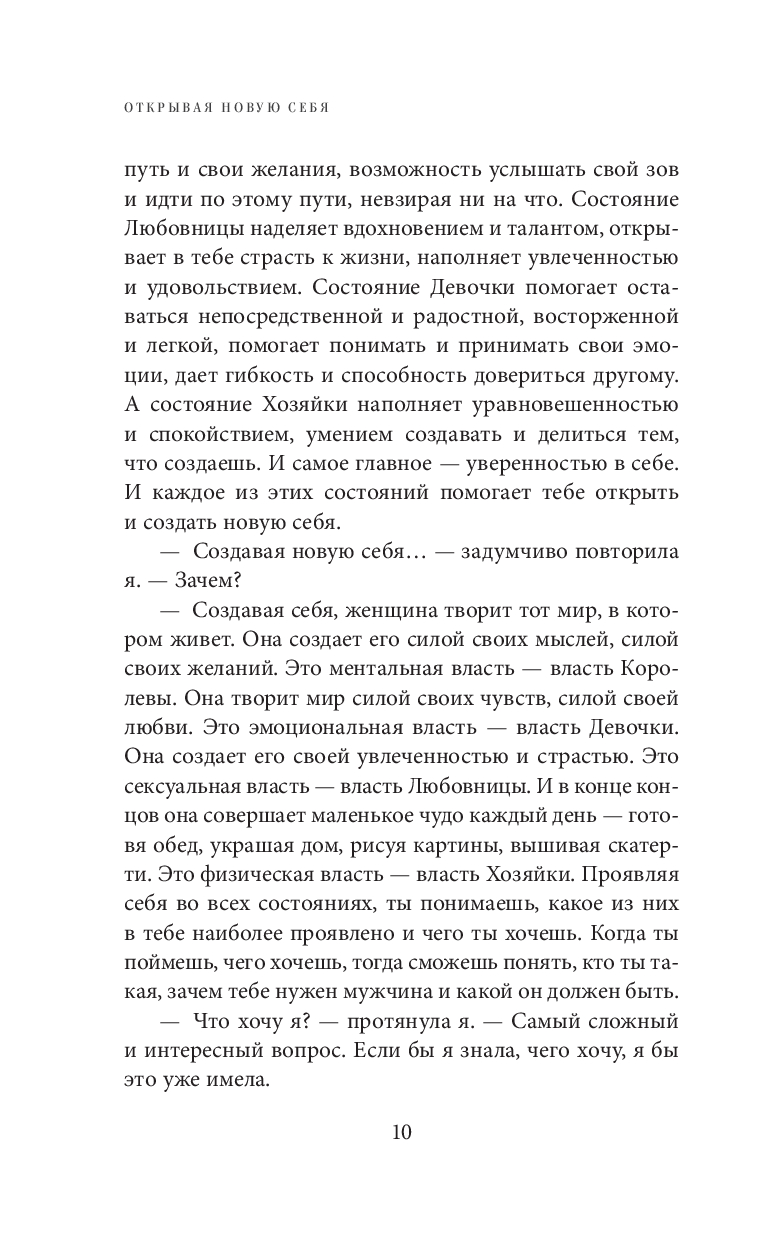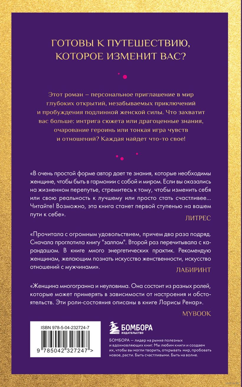 Эта книга – захватывающее путешествие женщины, полное открытий, приключений и поиска любви, счастья и истинного "я". Обучающий роман, где через интригующий сюжет, флирт, страсть, мудрость и творчество вы откроете для себя уникальную систему женских энергетических практик и психологических игр. Четыре страны, четыре психологических состояния, четыре стихии, четыре тайны – для современной Афродиты. Отправляясь в это увлекательное путешествие вместе с Ларисой Ренар, вы делаете шаг навстречу своему счастью.