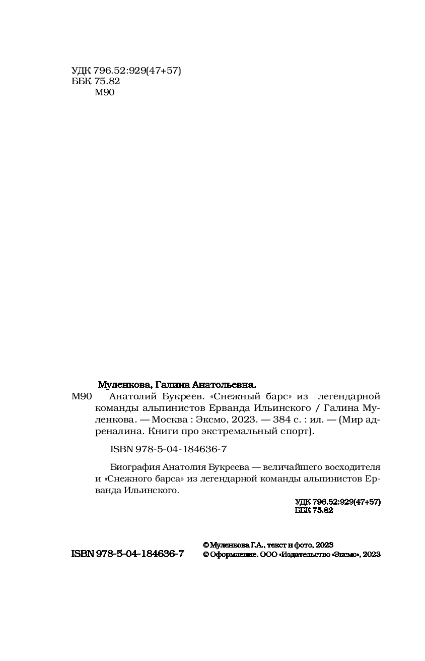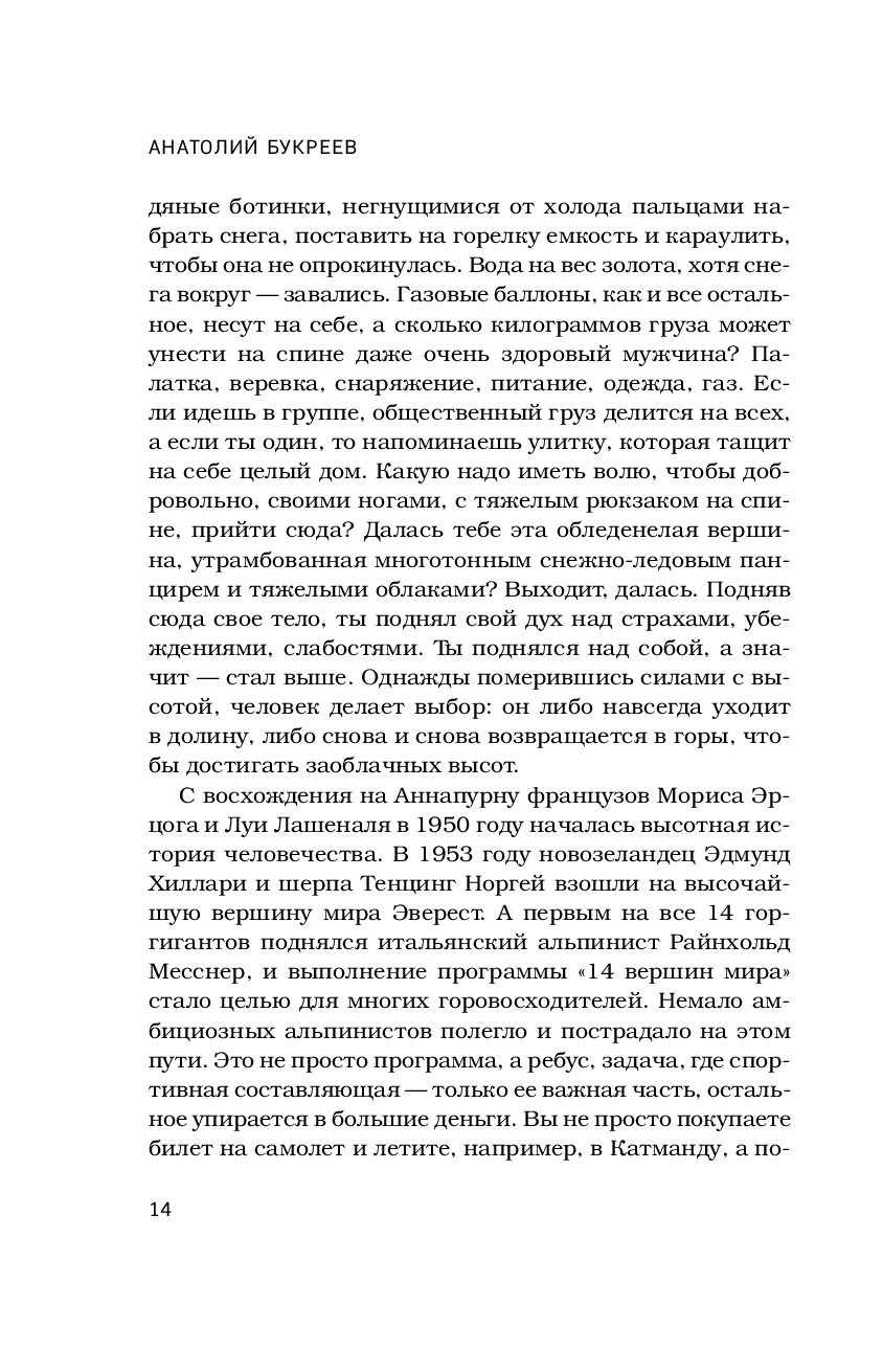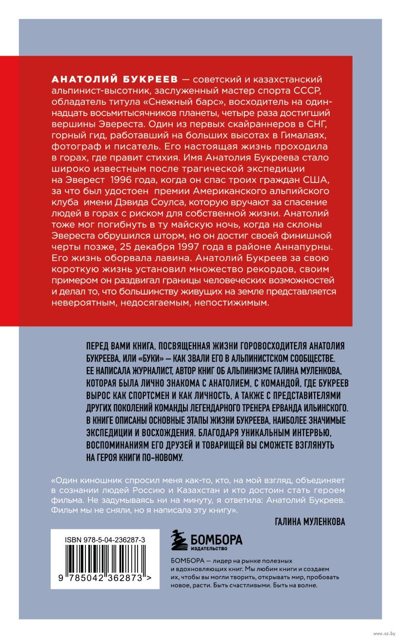 Перед вами книга, посвященная жизни горовосходителя Анатолия Букреева, или "Буки", – как звали его в альпинистском сообществе. Ее написала журналист, автор книг об альпинизме Галина Муленкова, которая была лично знакома с Анатолием, с командой, где Букреев вырос как спортсмен и как личность, а также с представителями других поколений команды легендарного тренера Ерванда Ильинского. В книге описаны основные этапы жизни Букреева, наиболее значимые экспедиции и восхождения. Благодаря уникальным интервью, воспоминаниям его друзей и товарищей вы сможете взглянуть на героя книги по-новому.