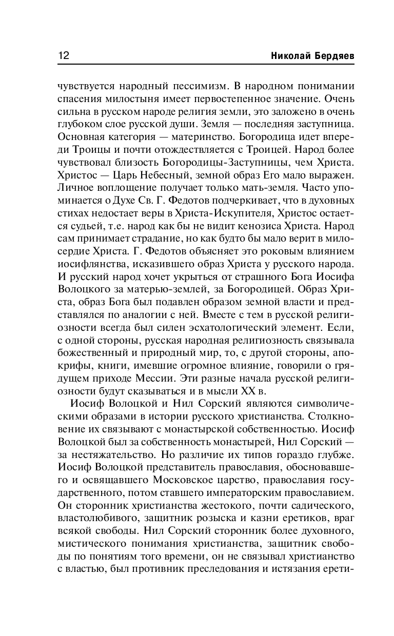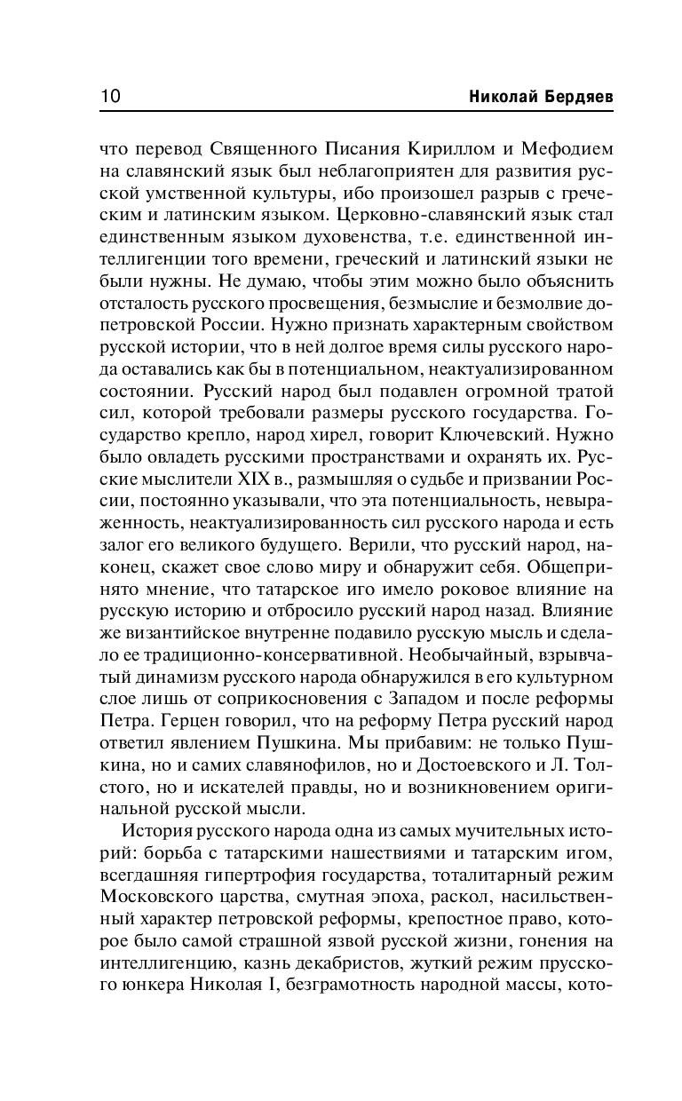 Размышления Бердяева охватывают исторические события от Крещения Руси до Октябрьской революции, неразрывно связанные с деятельностью протопопа Аввакума, Петра I, Чаадаева, Достоевского, Соловьева и Ленина.