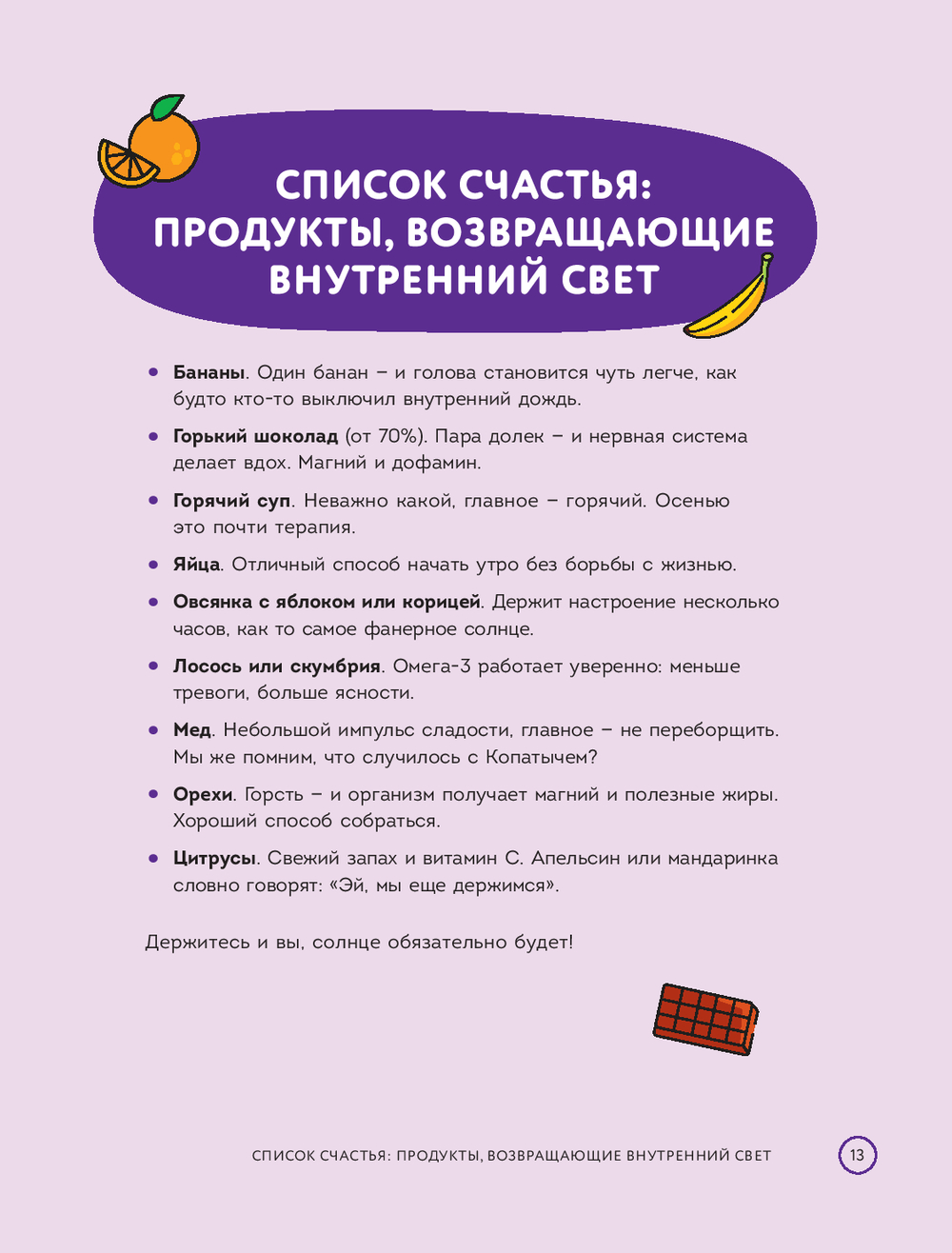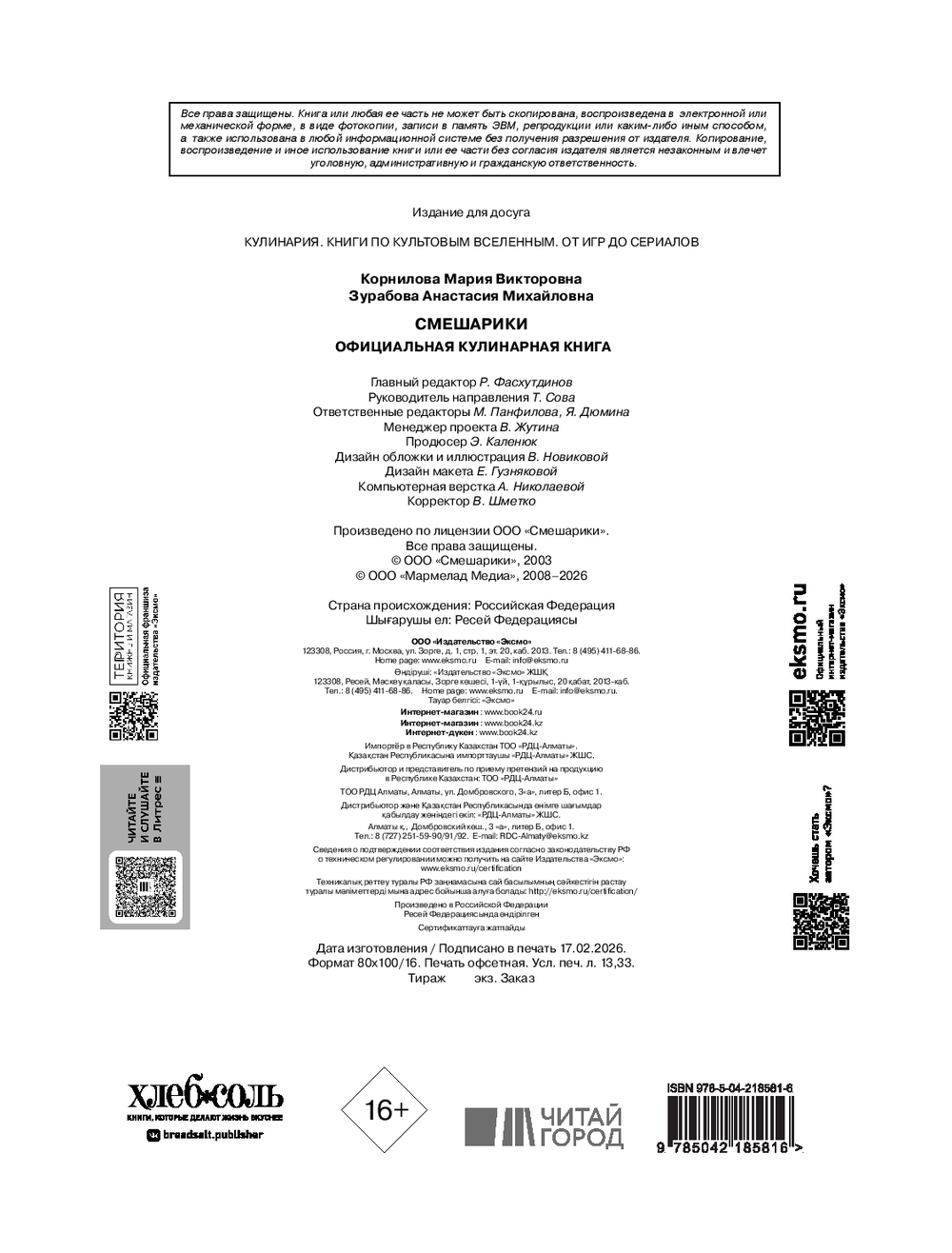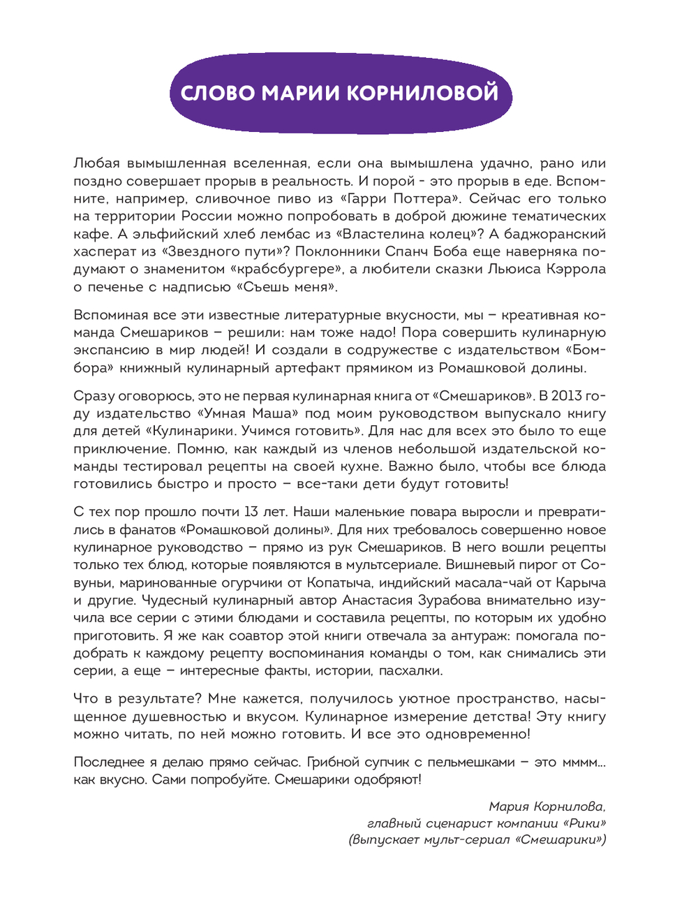 Отправьтесь во вкусное путешествие в мир любимых героев, где каждая страница наполнена ароматами, юмором и теплом! Вместе с Совуньей, Лосяшем, Нюшей, Пином и другими Смешариками вы приготовите настоящие блюда из мультсериала: от воздушных блинов и шоколадных трюфелей до ярких супов, десертов и домашних напитков. А еще приоткроете завесу секретов: куда делся утюг в супе Совуньи, чем создатели вдохновлялись, когда придумывали серию "Бутерброд" и что скрывается за невинной серией "Горы и конфеты"!