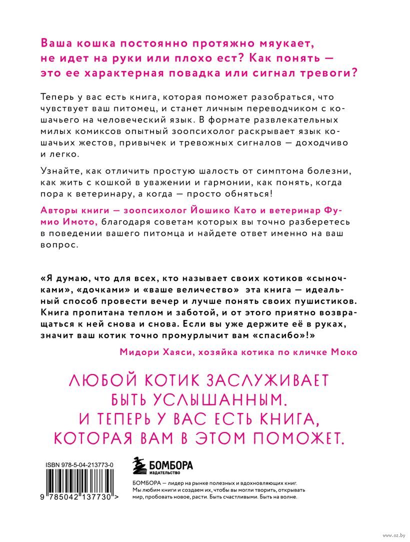 С юмором, простотой и любовью опытный зоопсихолог Йошико Като и ветеринар Фумио Имото расскажут вам о том, что означают кошачьи взгляды, жесты и движения. Как ваш питомец пытается сказать, что любит вас, и когда его поведение может сигнализировать о болезни.
