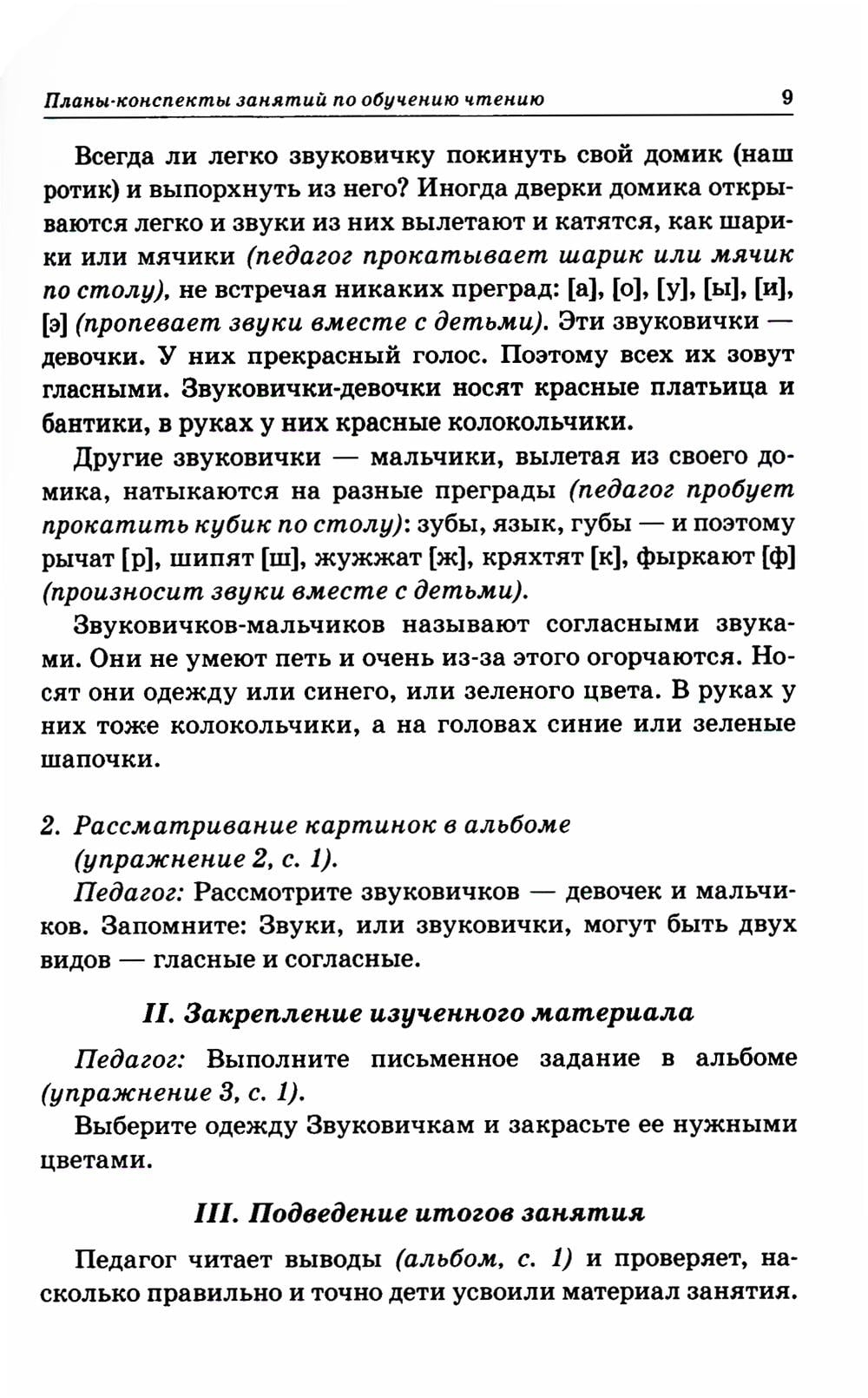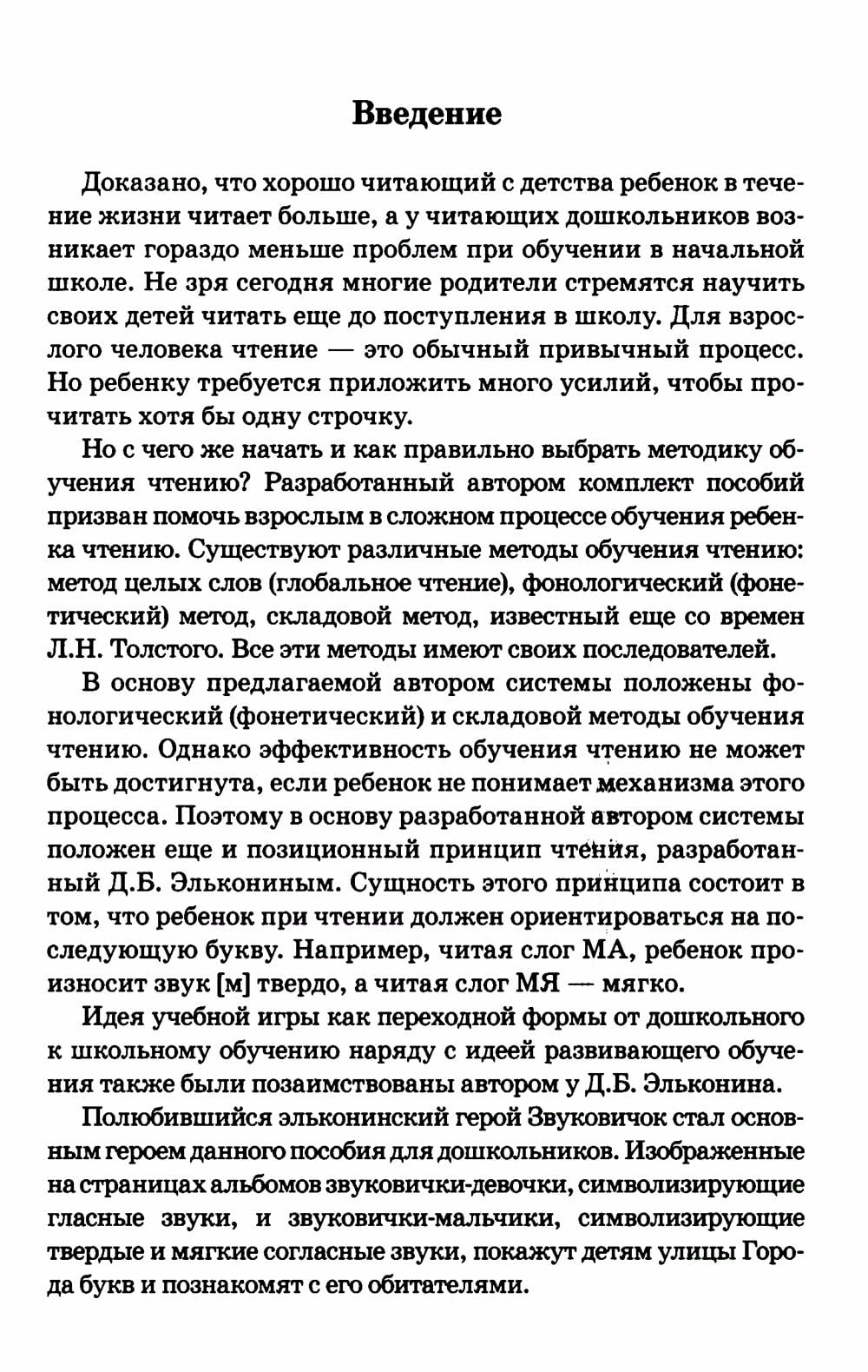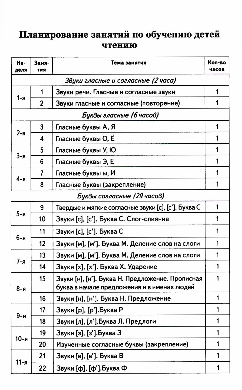 Система работы, предложенная автором, основана на складовом методе обучения чтению и позиционном принципе чтения, разработанным Д. Б. Элькониным. Работа по обучению чтению осуществляется в следующей последовательности: изучение гласных букв парами; изучение парных по твердости и мягкости согласных звуков в рамках одного занятия; овладение чтением посредством складового метода; использование цветных символов для обозначения звуков; работу по составлению схем слов и предложений; знакомство детей с рядом грамматико-орфографических правил; расширение и уточнение представлений детей об окружающей действительности, обогащение их словарного запаса и развитие речи.